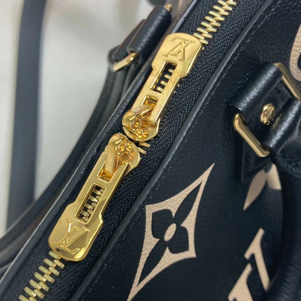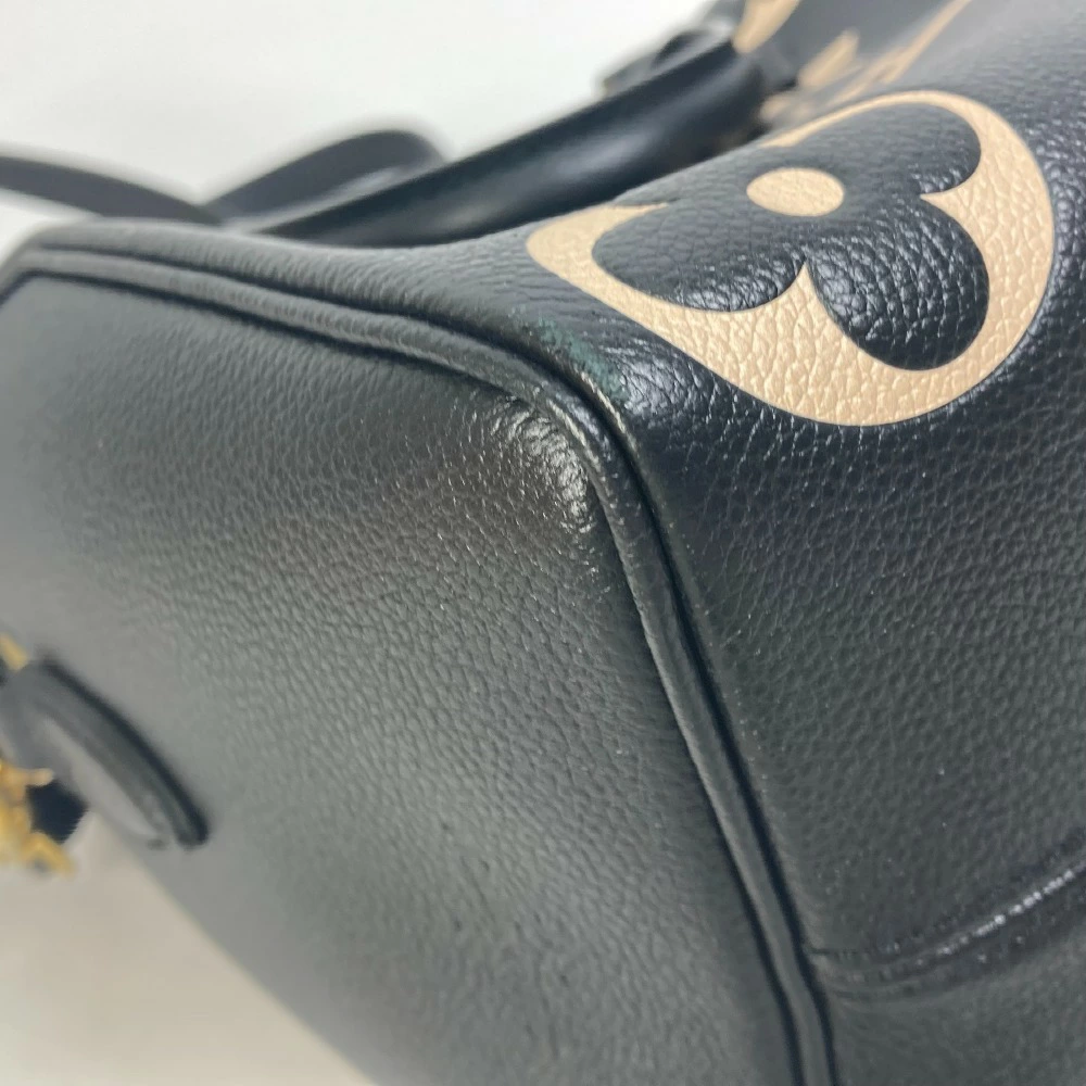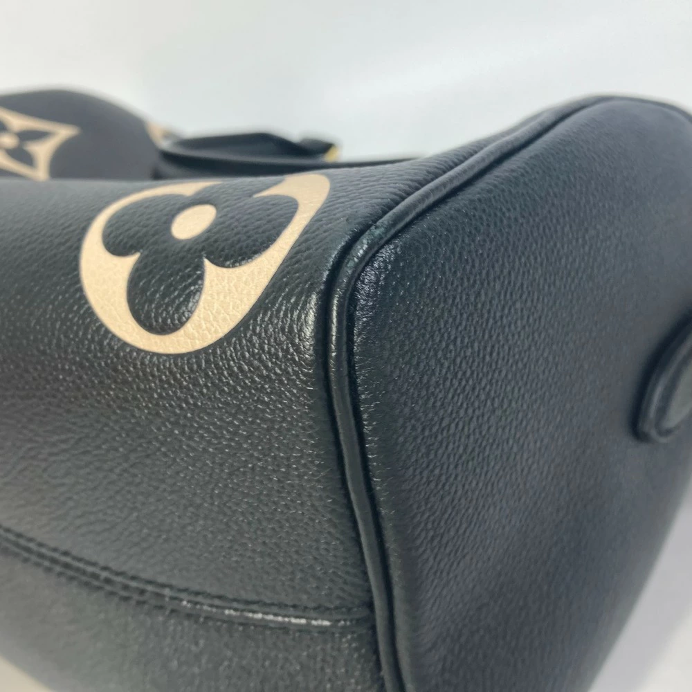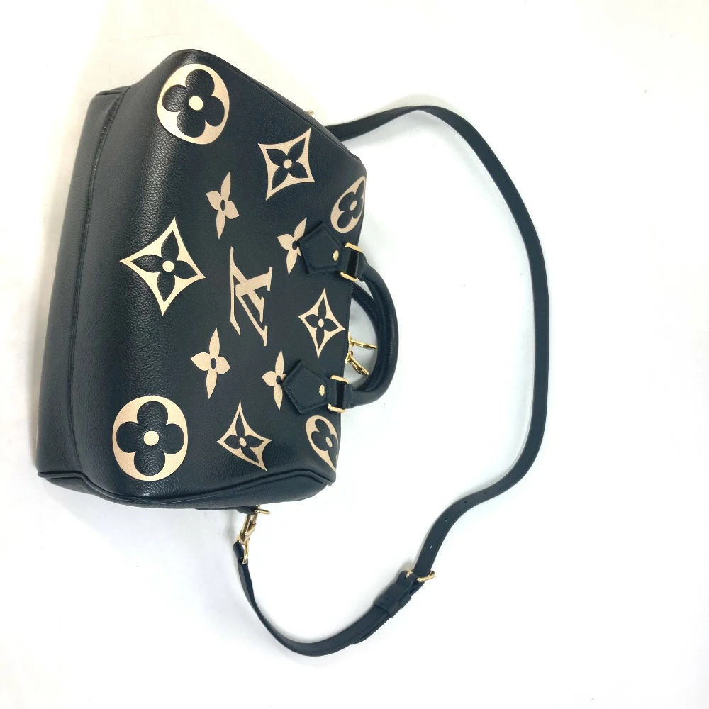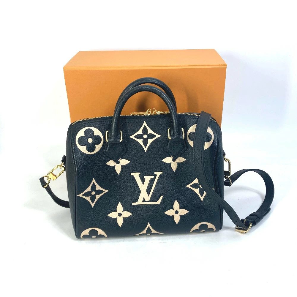| 商品説明 | ベージュのモノグラム・ジャイアント パターンをエンボス加工で施した、ブラックのモノグラム・アンプラント レザーで仕立てた「スピーディ・バンドリエール 25」。 |