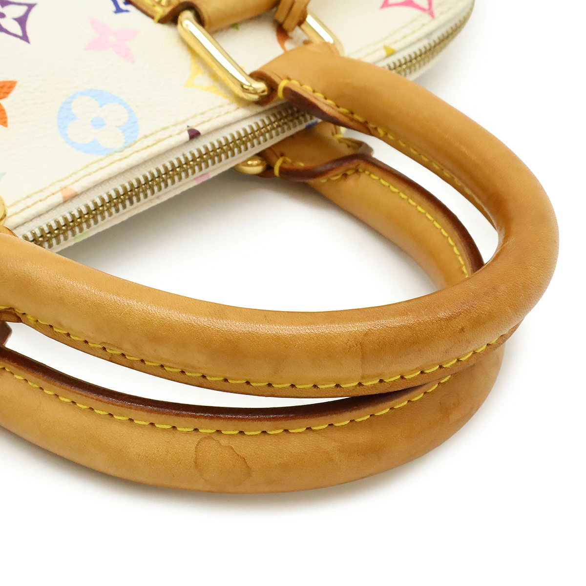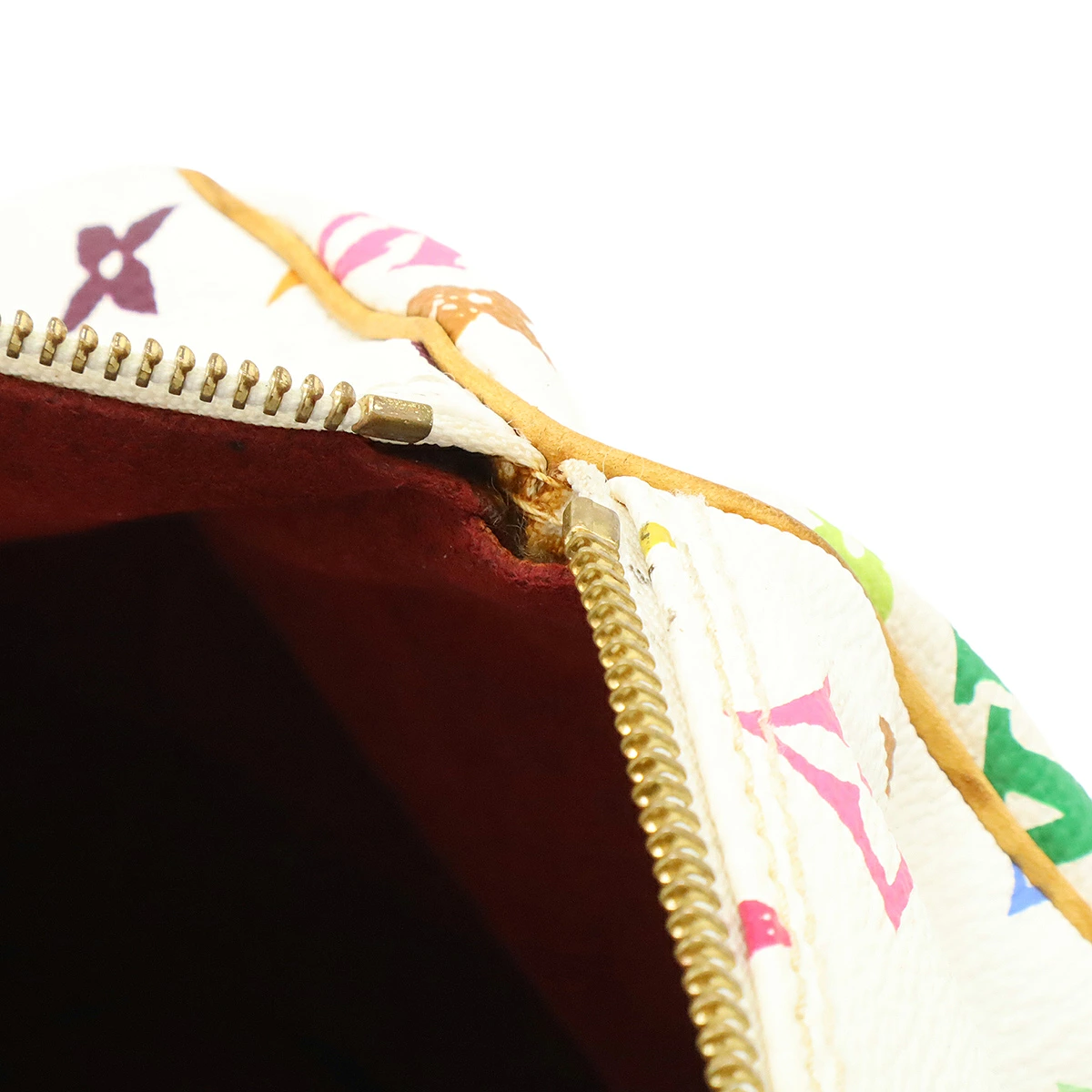スレ、型崩れ、若干の黄ばみ、ポケットフチ変色、ヌメ革ヤケ、シミ、ファスナープルペン跡