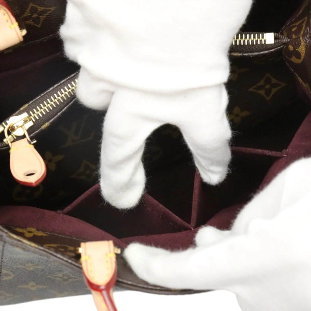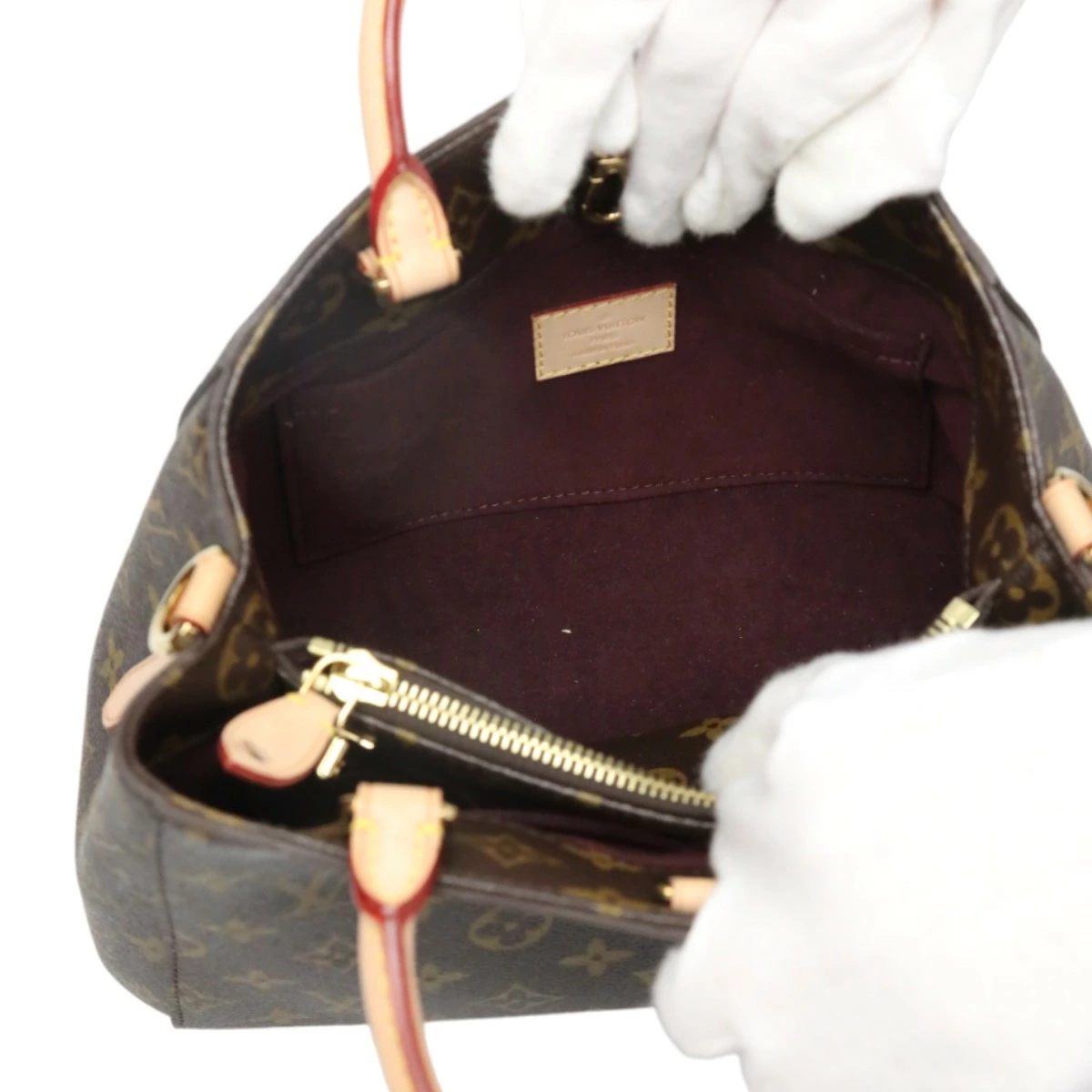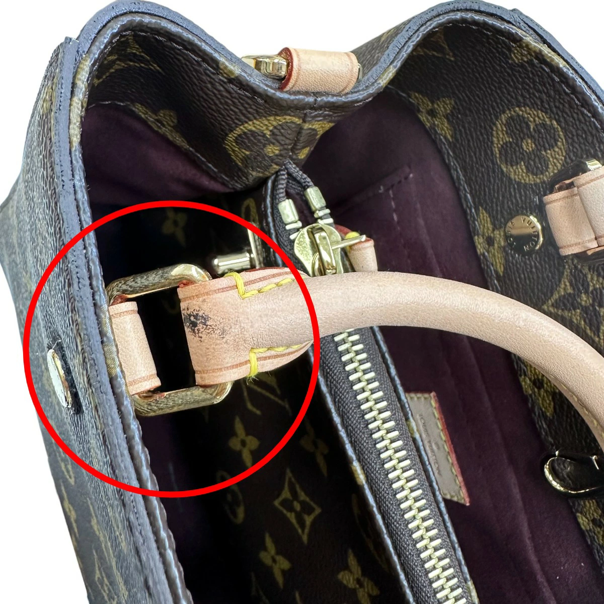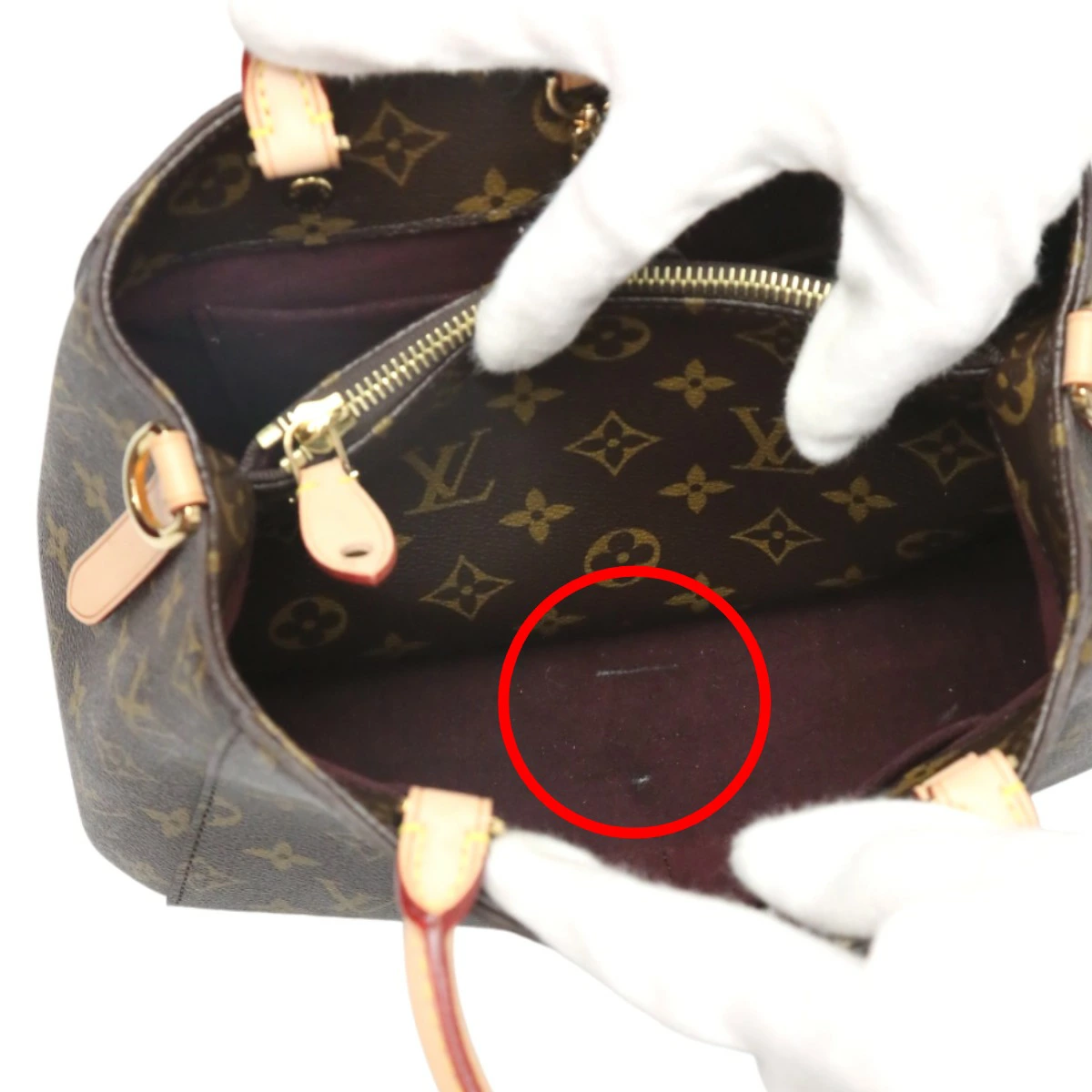 | 外側 | ランク:SA 切り替えし部分:小キズ ハンドル・ストラップ:薄汚れ、汚れ 底面に底鋲に小キズあり ハンドル付け根部分に汚れあり 汚れあり |