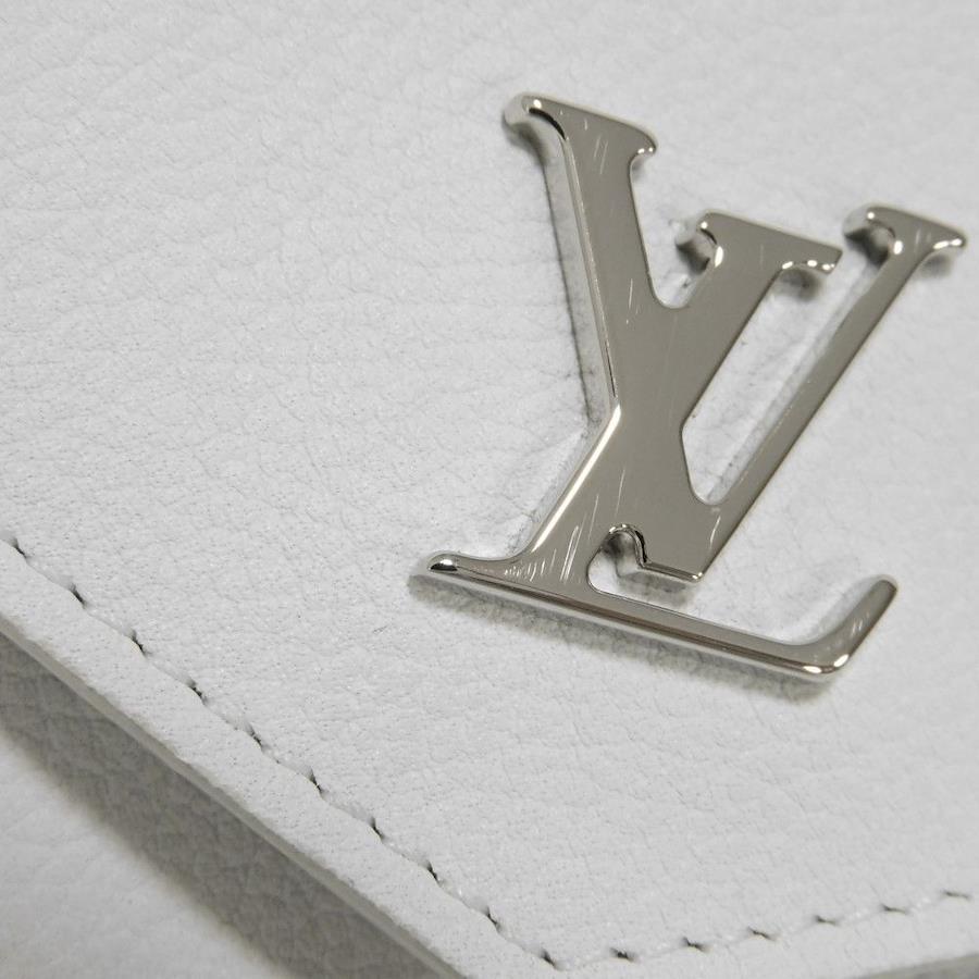 | 型押しが施された、ソフトカーフレザーにルイヴィトンのLVイニシャルをあしらった「ポルトフォイユ・ロックミニ」コンパクトなスナップ式三つ折り財布です。 |