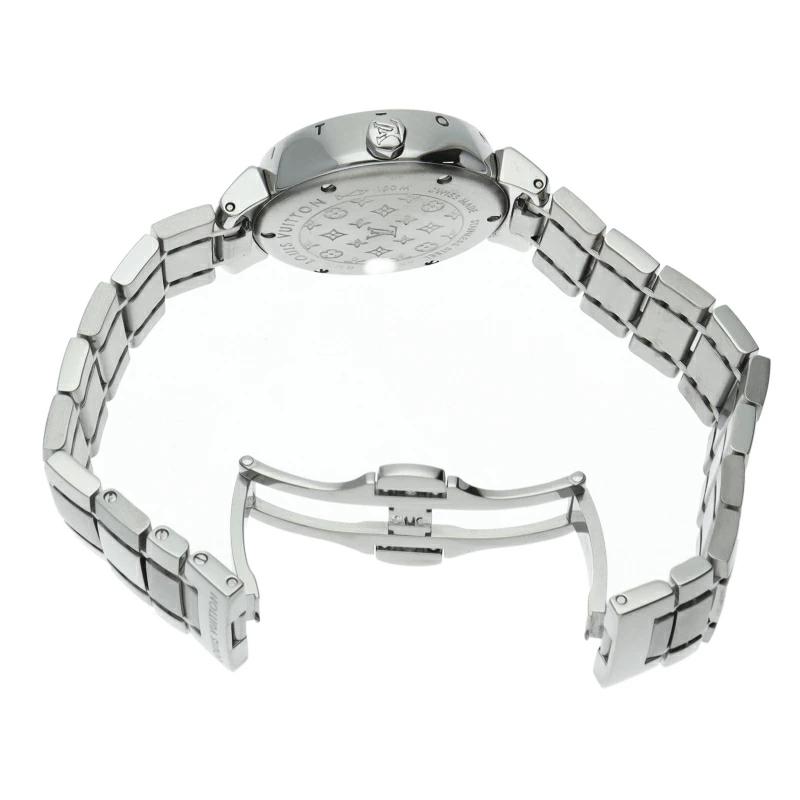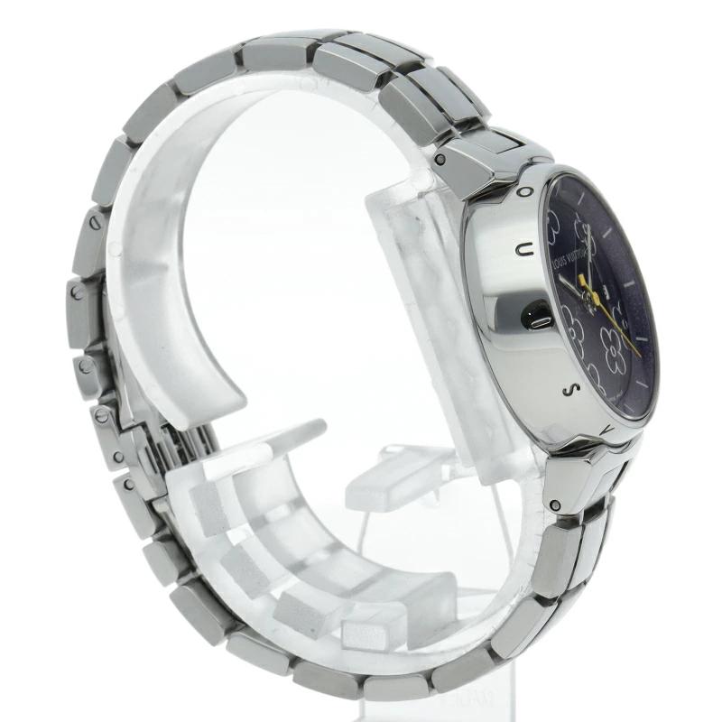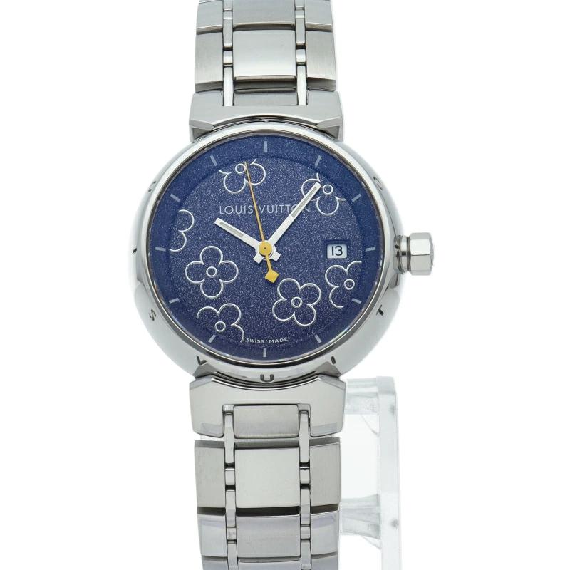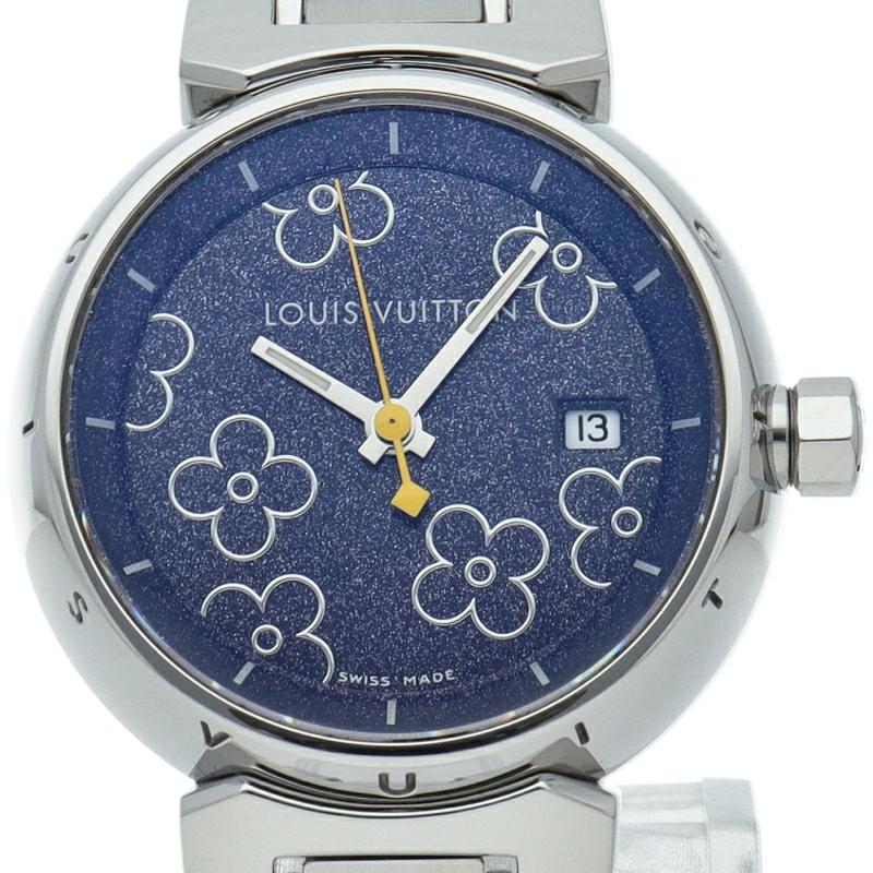 | ルイ・ヴィトンの旅のスタイルをデザインした「タンブール」。こちらは中央のVモチーフの黄色が映え、裏蓋にはモノグラムフラワーなどが施されるなど、こだわりと遊び心が見られます。タンブールとは太鼓を意味しておりケースが太鼓のように丸くふっくらした腕時計です。 |