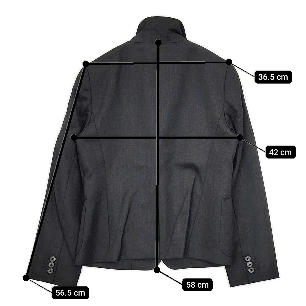 実寸サイズ | 肩幅:約36.5cm 着丈:約58cm 身幅:約42cm 袖丈:約56.5cm ウエスト:約32cm ヒップ:約41cm ※採寸画像がある商品はハンガーに吊るした状態での計測のため、平置きでの採寸とは差が生じる場合がございます。平置きでの実寸サイズをご希望の場合は、ご購入前に必ずご質問ください。 ※記載以外のサイズが合わないことを理由とした返品はできませんので、 記載部分以外で実寸サイズの気になる箇所があれば必ず購入前にご質問ください。 |