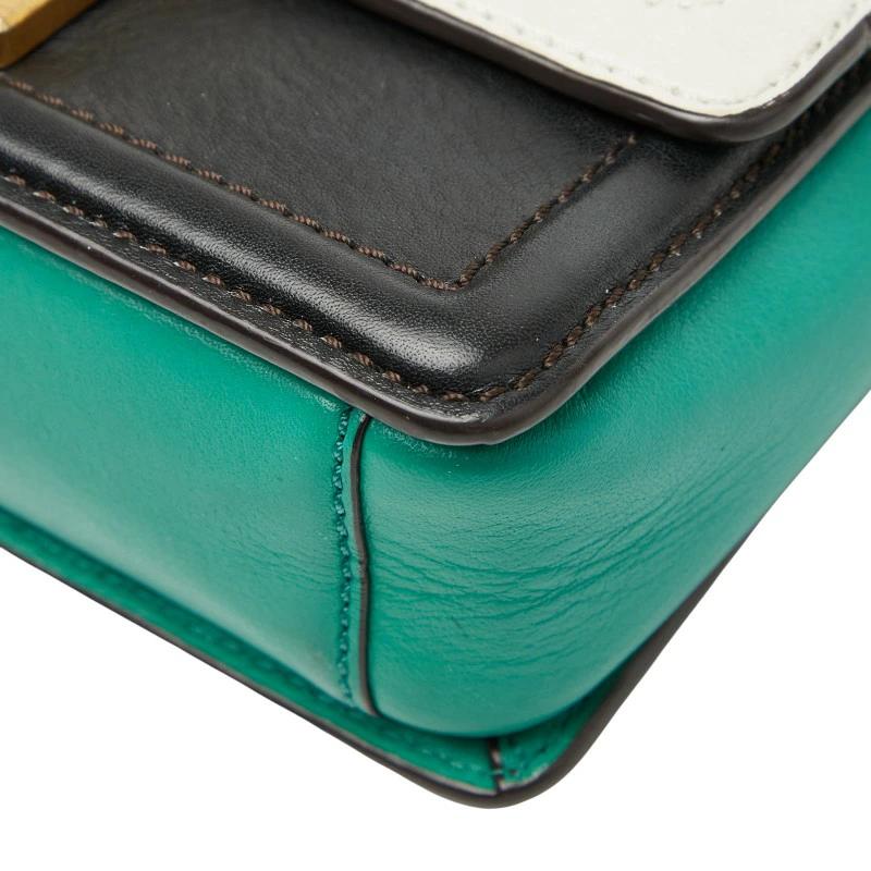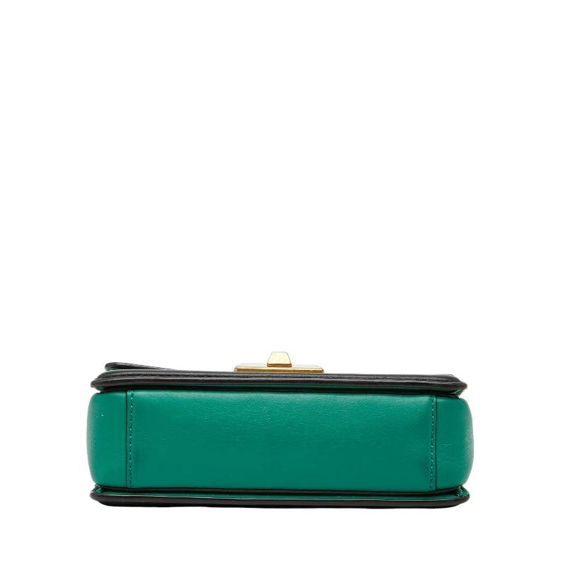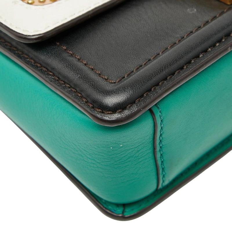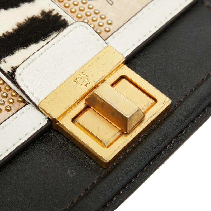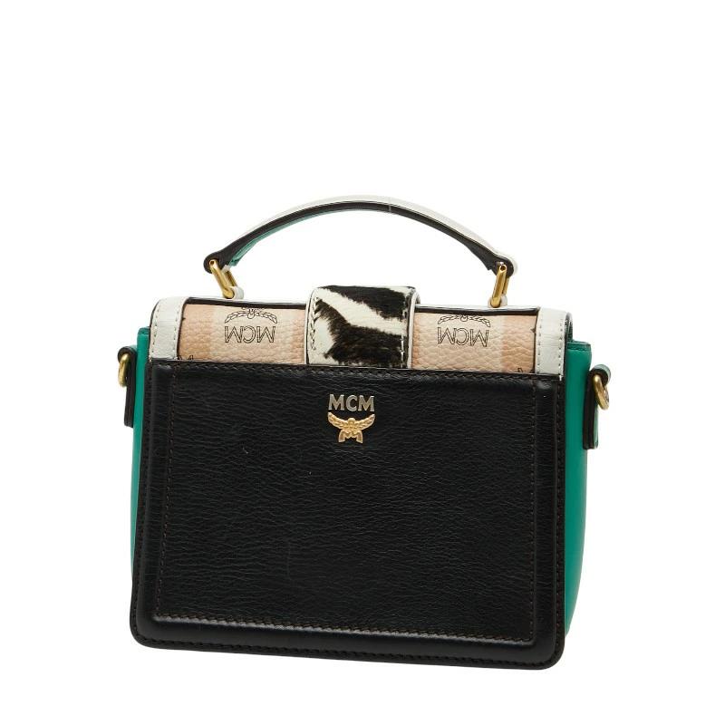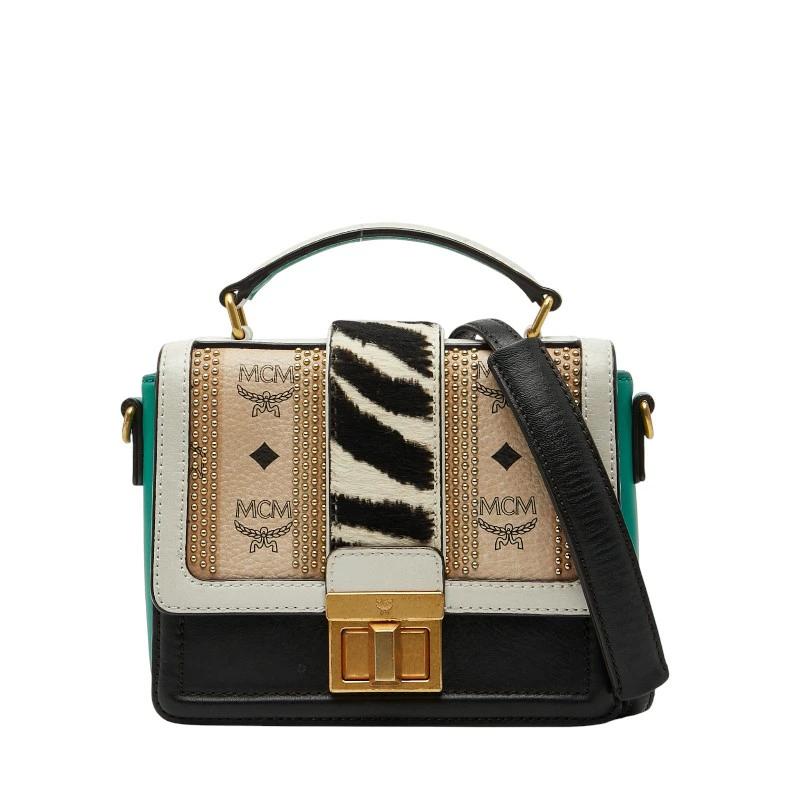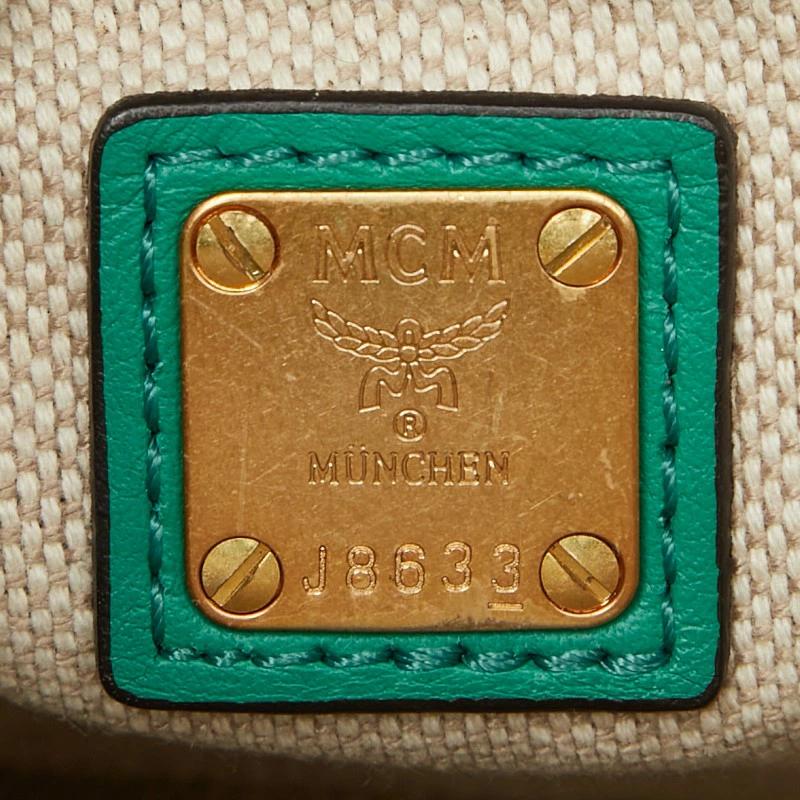 Pre-owned MCM Visetos Logogram Studded Shoulder Bag in Black, Beige, and Green Leather.