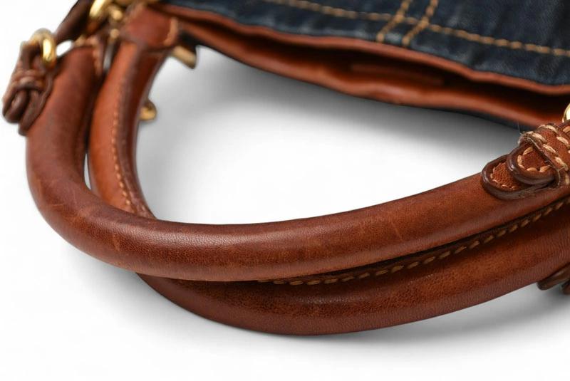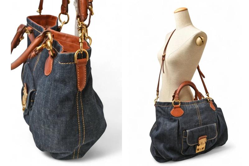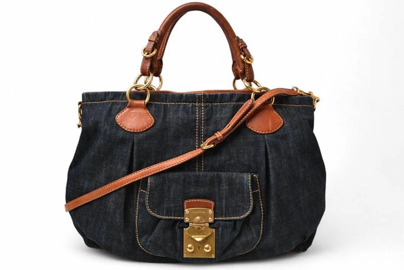 | 商品説明 | ミュウミュウより、人気の高い2wayバッグです。デニムとブラウンのバイカラーデザインが美しい2WAYバッグが登場。ハンドバッグとしても、ショルダーバッグとしても使用可能で、A4サイズ収納対応の実用的な大容量タイプです。 |