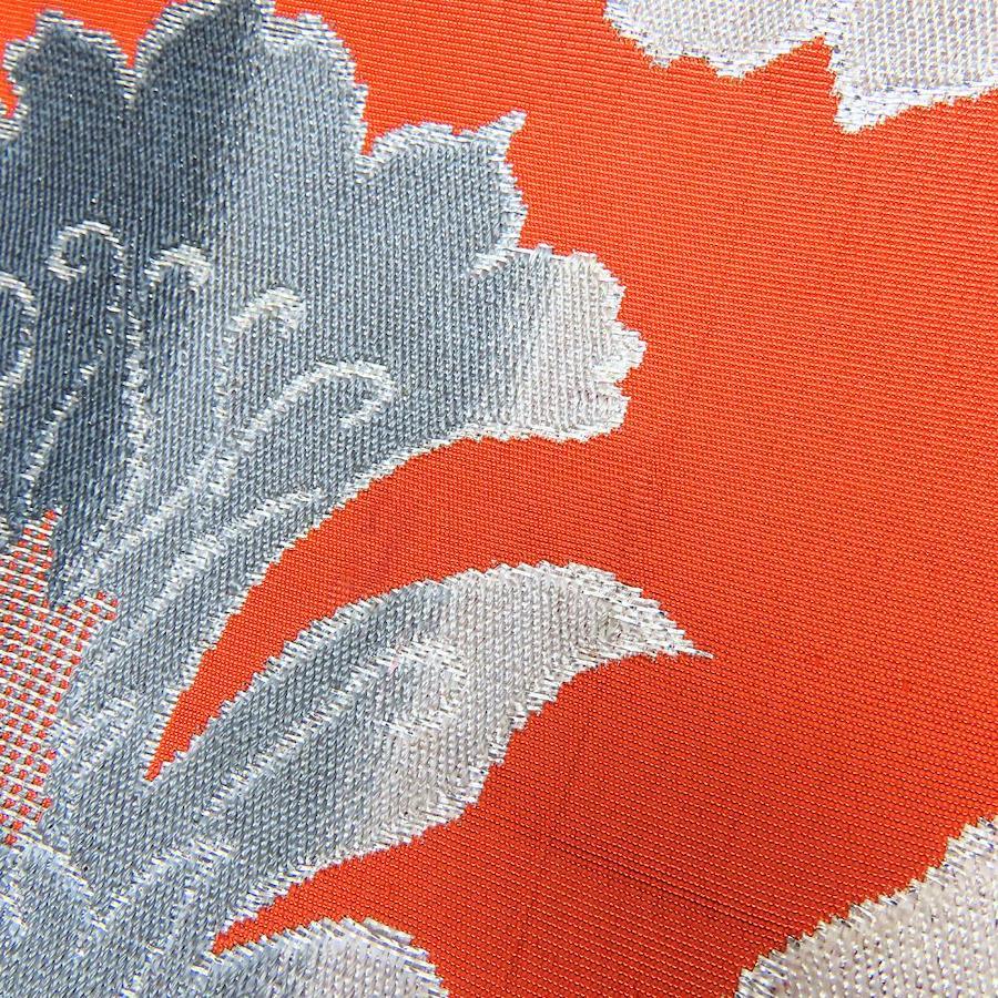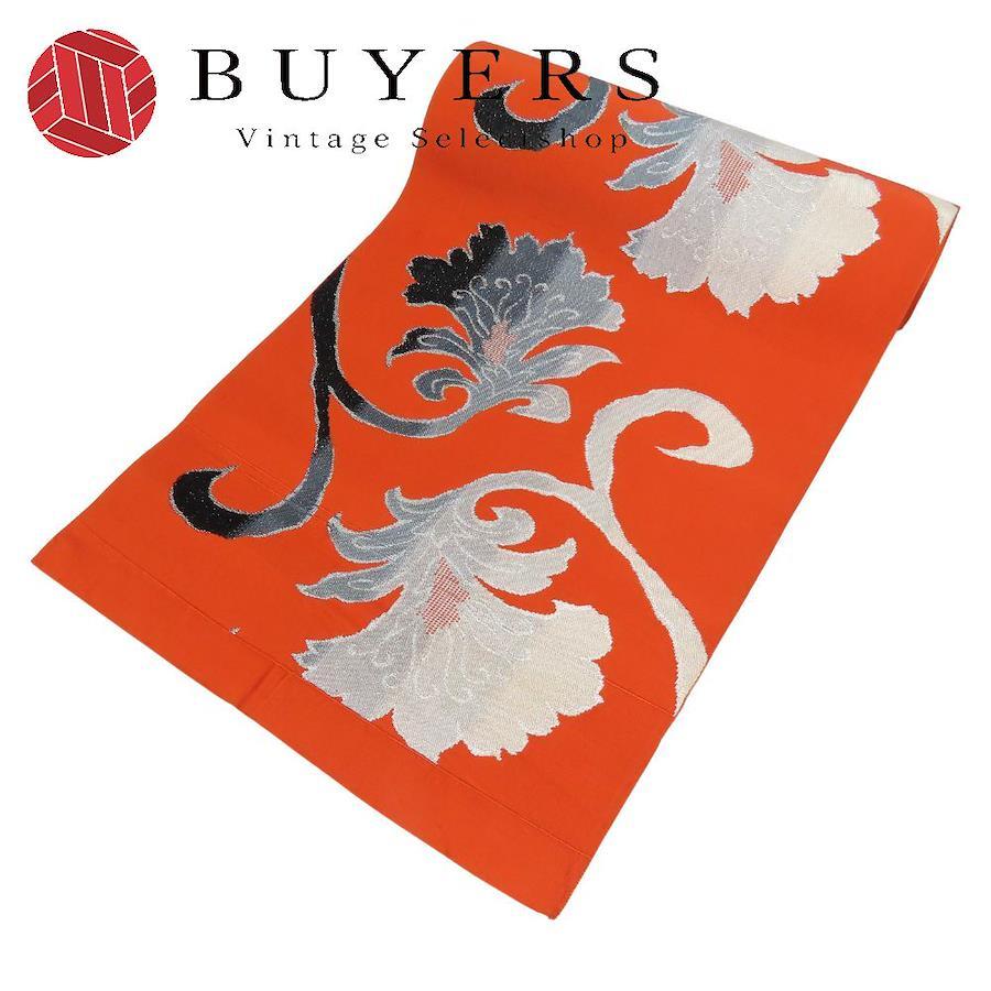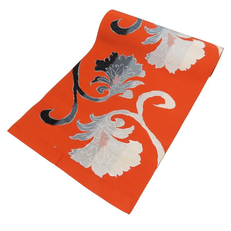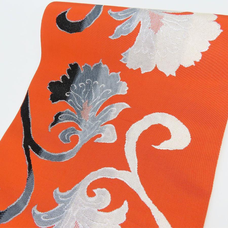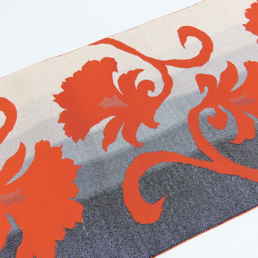 品名【中古】 名古屋帯 京袋 八寸 正絹(金銀糸除く) 銀糸 朱色 ブラック グレー ベージュ 唐草模様 レディース 女性