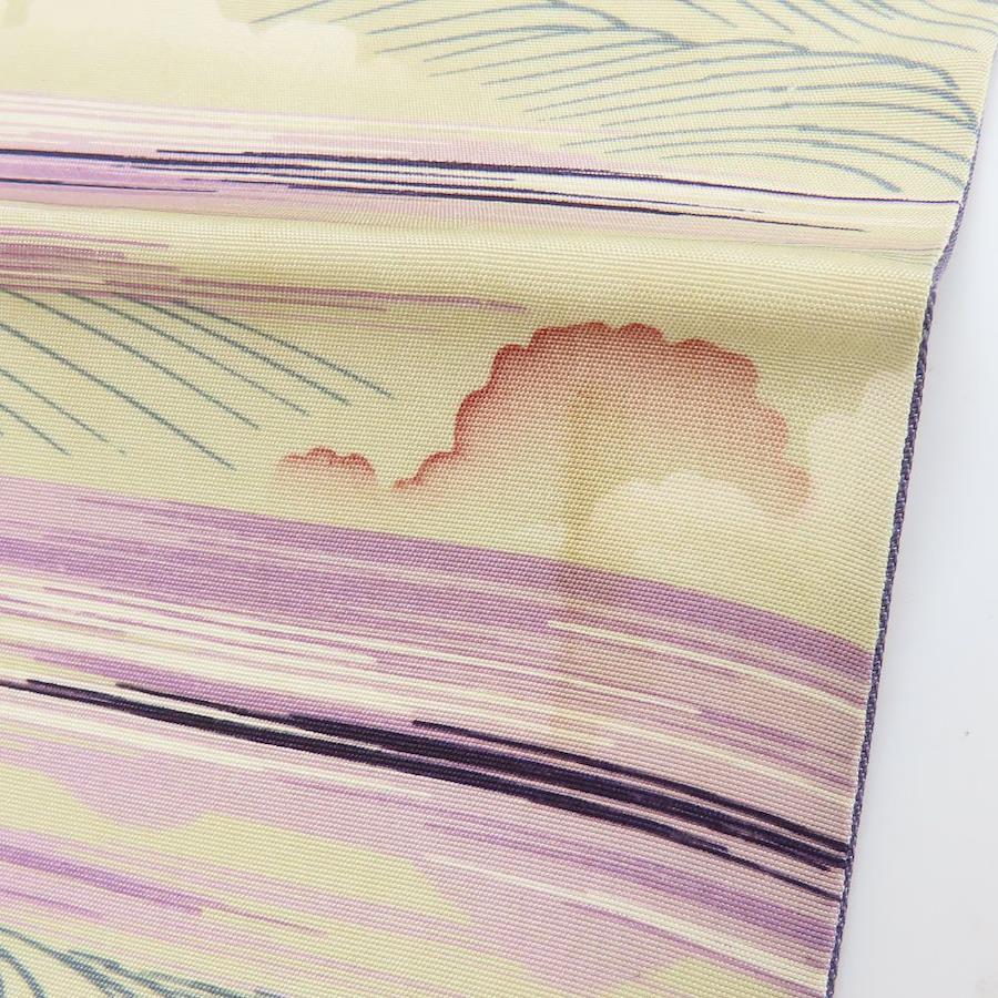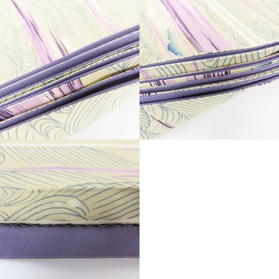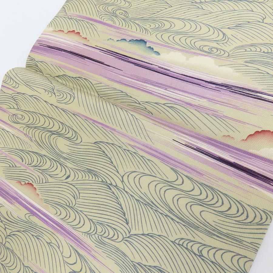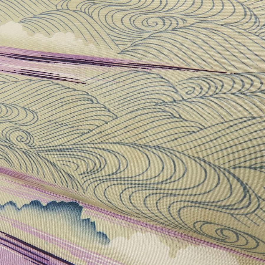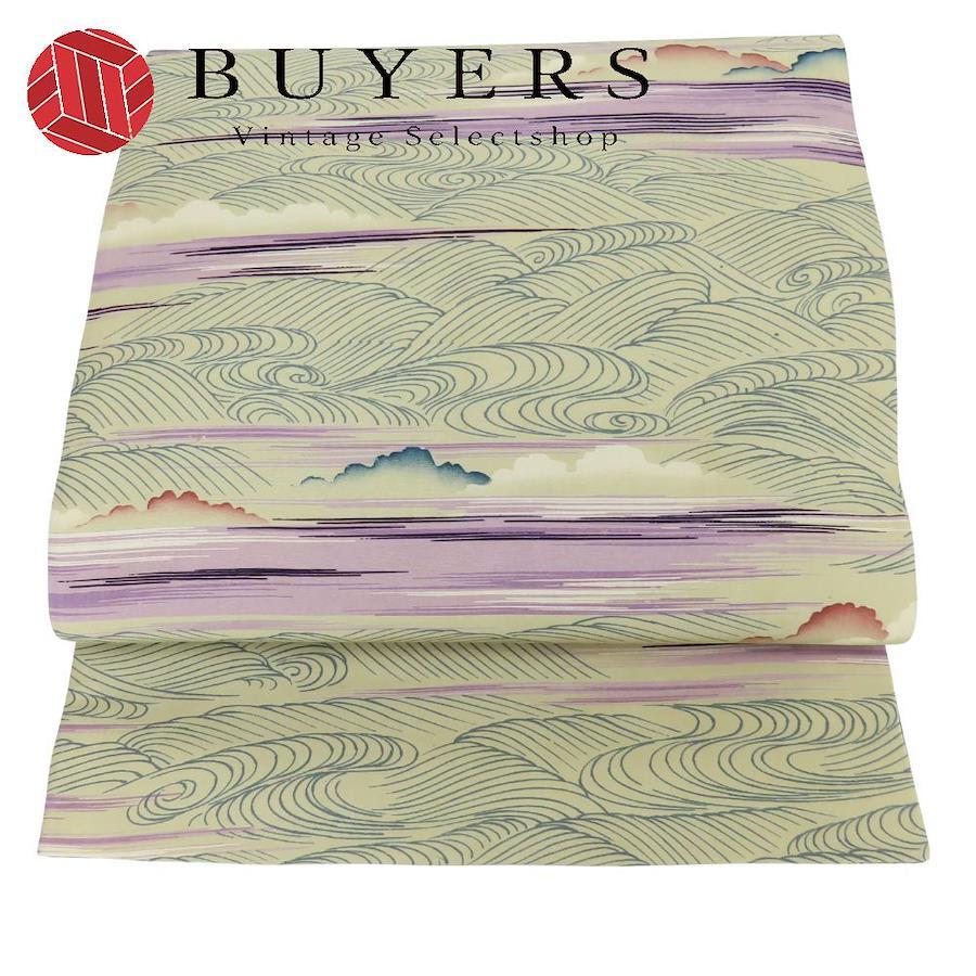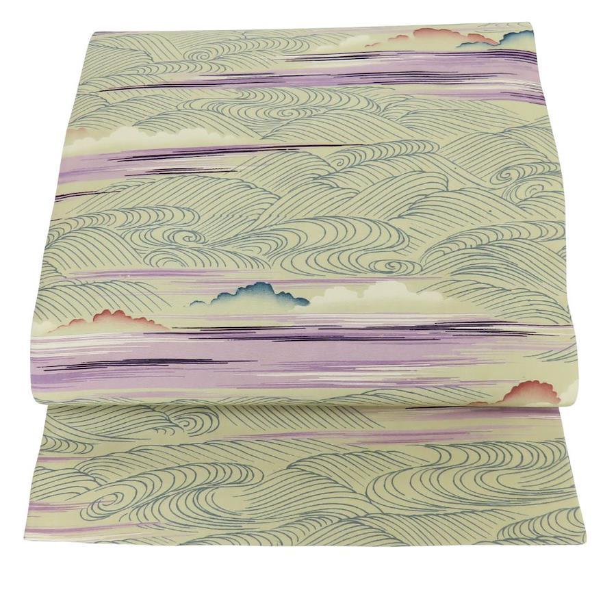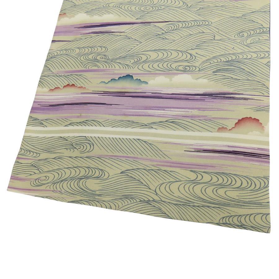 | 品名 | 【中古】 名古屋帯 京袋 九寸 正絹(金銀糸除く) ベージュ パープル ブルー系 全通柄 波 レディース 女性 |