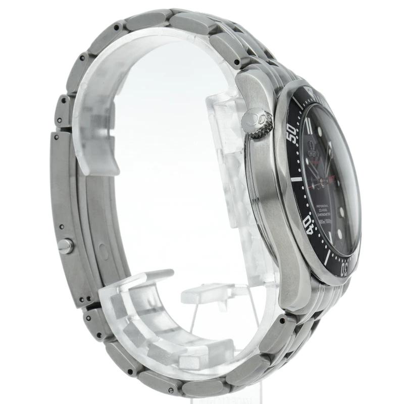 | シーマスターの2008年度の「007」リミテッドモデルです。この年はブラックダイヤルに007をあしらった針が特徴です。オメガのフラッグシップモデルであるシーマスターコレクション。ケースサイド10時には飽和潜水時のヘリウムガスによる風防破損事故を防ぐヘリウム・エスケープバルブ。潜水時間を計測できる逆回転防止付き回転ベゼルを備えており、機能性の高い逸品です。 |