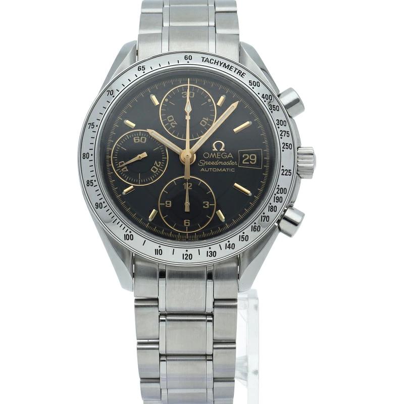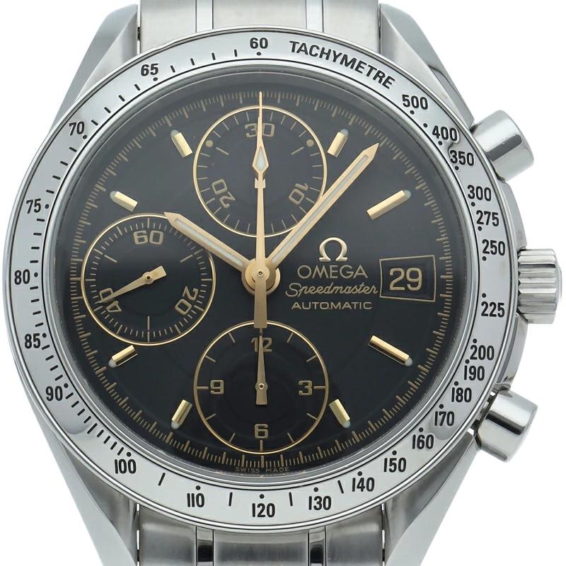 | オメガの代表的な人気シリーズ「スピードマスター・デイト」。クロノグラフ・デイト表示機能付きと便利で実用性のある1本です。日本限定のインデックスがゴールドの人気モデルです。 |