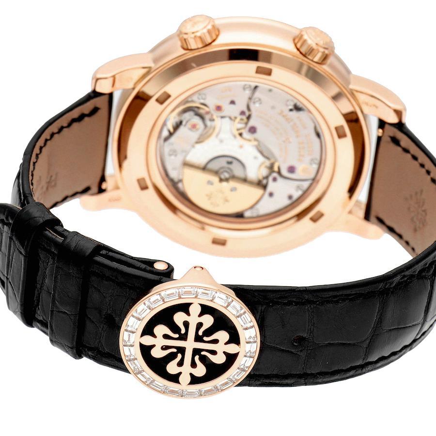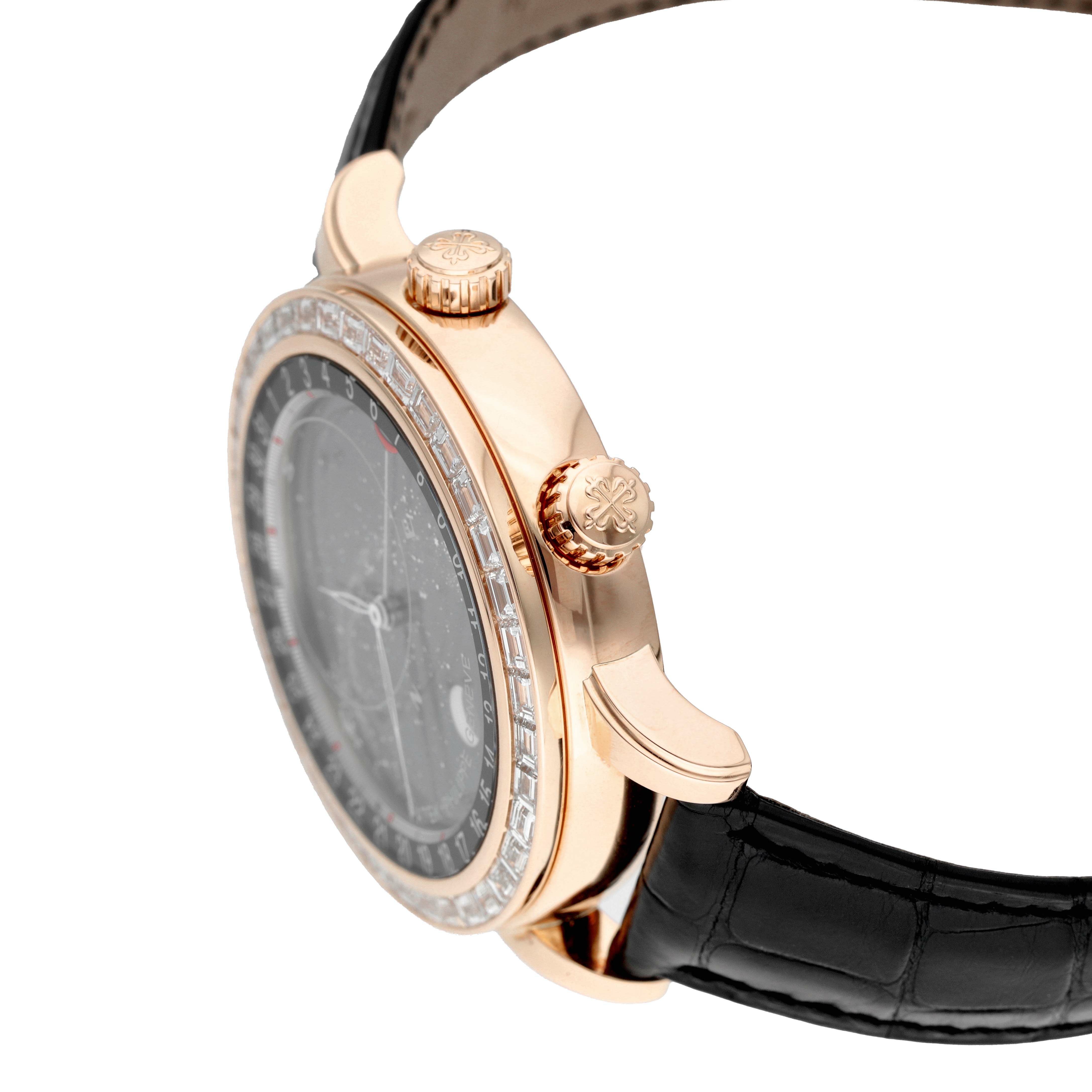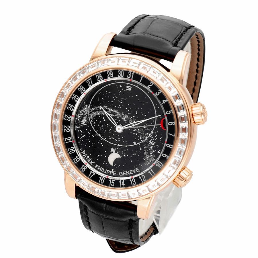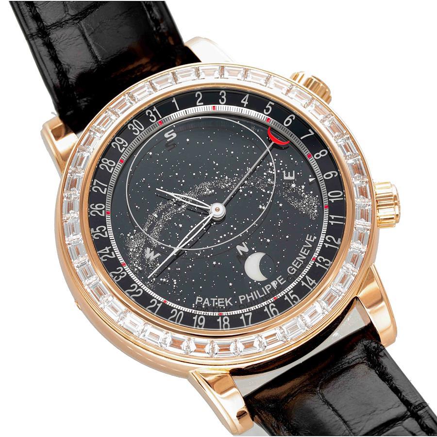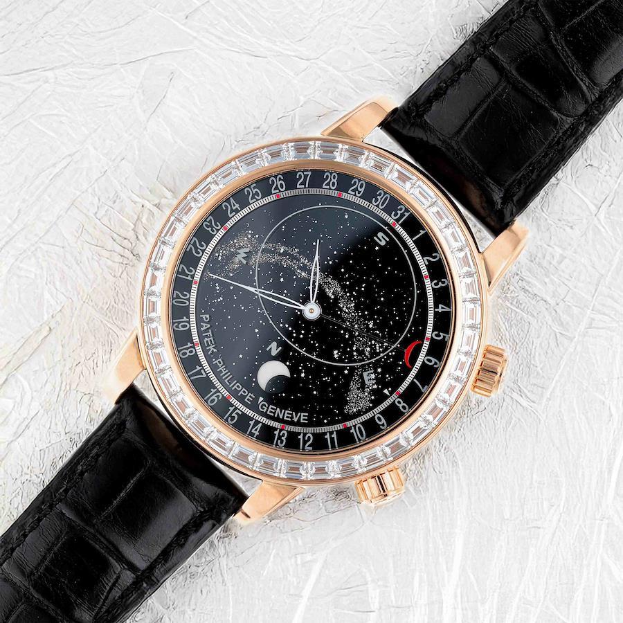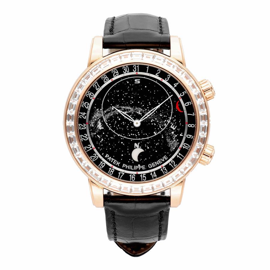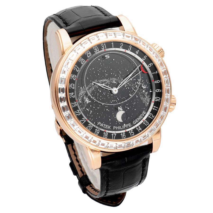 --------【商品スペック】--------お問合せコード:6104R-001ブランド:パテック フィリップシリーズ:セレスティアルケース素材:ローズゴールドベルト素材:レザーダイアルカラー:ブラックサファイアクリスタルムーブメント:自動巻(Cal.240LUCLC)ケースサイズ:44mm(リューズ除く)防水:日常生活防水ガラス:サファイアクリスタル仕様:日付表示、バックスケルトン、平均太陽時(通常の時刻)による時・分表示 星座表、月の軌道とムーンフェイズ表示 シリウス星の子午線通過時刻、月の子午線通過時刻、合計60個のバゲットカット・ダイヤモンド(約5.4カラット)付属品:純正BOX、国際保証書(2023年)保証:当店購入日より1年保証