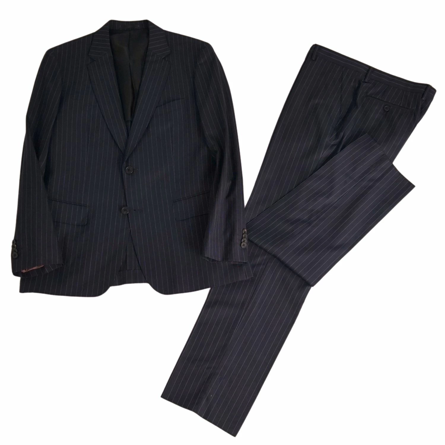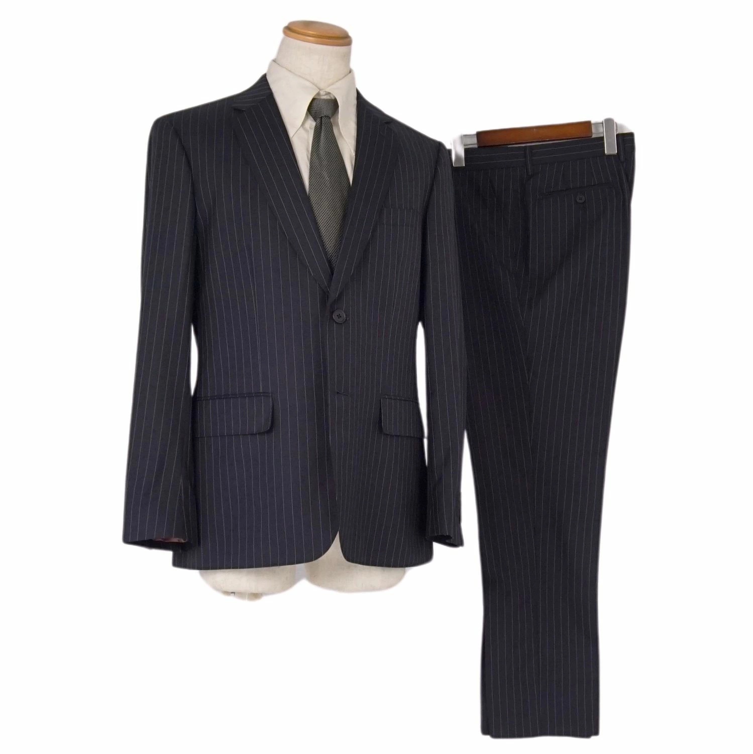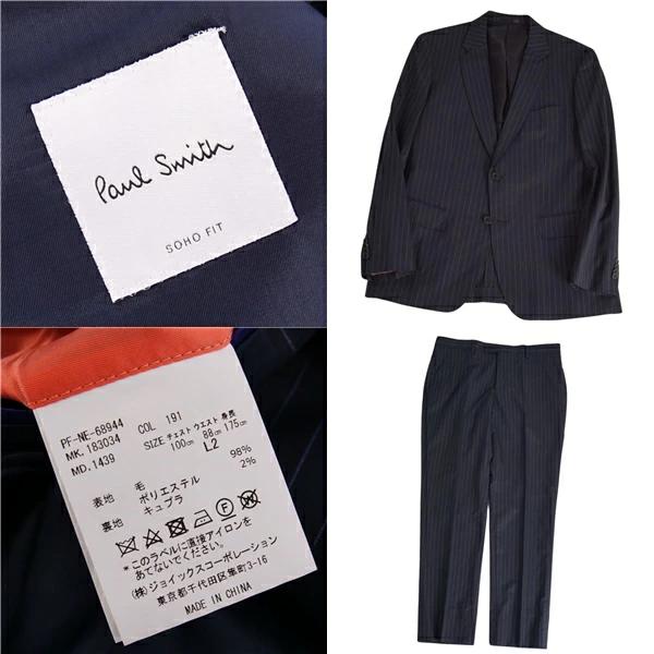 ■商品名ポール・スミス Paul Smith セットアップ スーツ シングル ストライプ ウール ジャケット パンツ メンズ ネイビー サイズXL■状態説明・上質なウール素材を使用した、Paul Smithのセットアップ(ジャケット/パンツ)です♪・春夏秋シーズンでお使い頂ける一品です◎・ジャケット:シングル 2ボタン 背抜き サイドベンツ・パンツ:ノータック 裾シングル・国内正規取り扱いの製品です。・USEDですが気になるようなキズや汚れなどはなく全体的にキレイな状態です!【季節感:春夏秋】【付属品:なし】■素材表地:ウール98% ポリエステル2% 裏地:キュプラ■カラーネイビー■表記サイズXL■実寸サイズ着丈:約73cm身幅:約52cm肩幅:約43cm袖丈:約62cmパンツウエスト/わたり幅:約88/31cm/cm股上/股下:約26/78cm/cm裾幅/総丈:約19/102cm/cm■状態ランクA 使用感の少ない全体的にキレイなUSED品■店舗管理番号ce10dr-rm10e34111mens_navy mens_xlup
