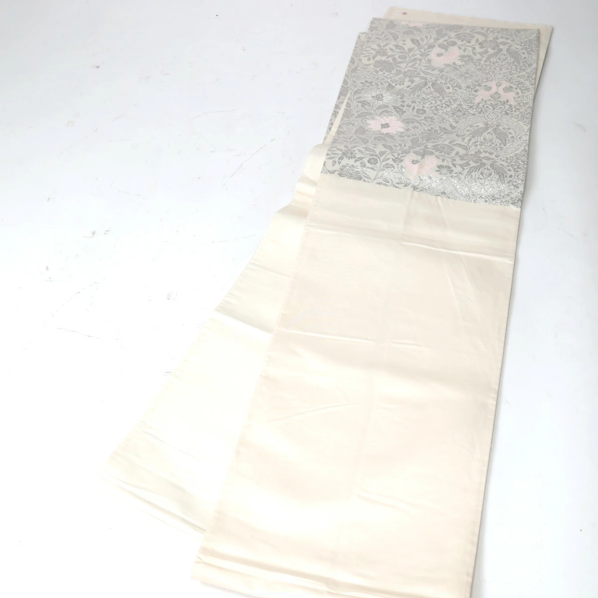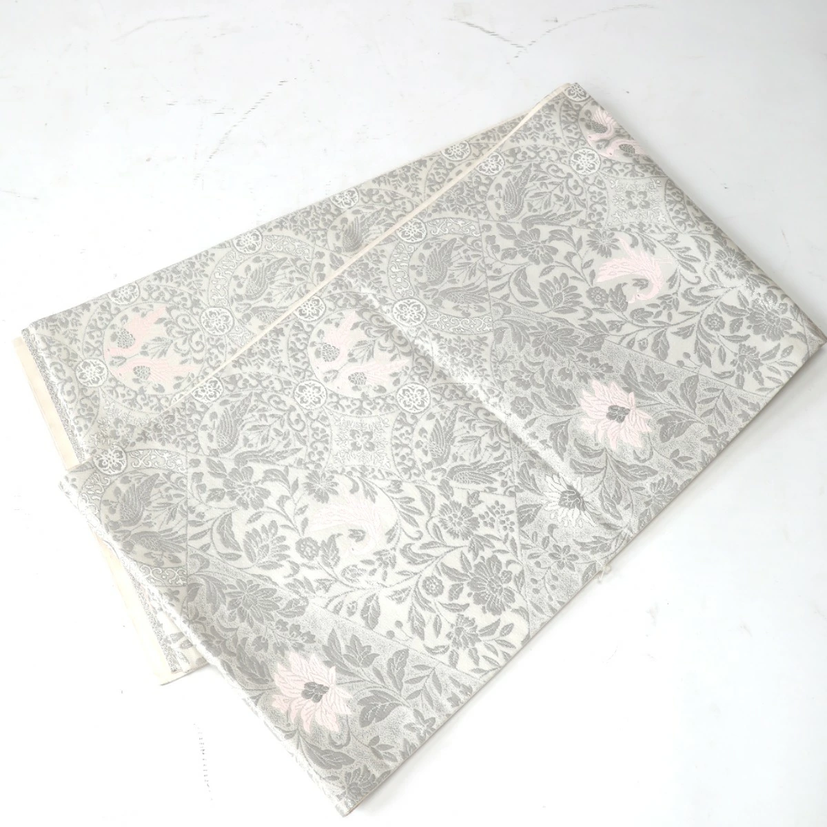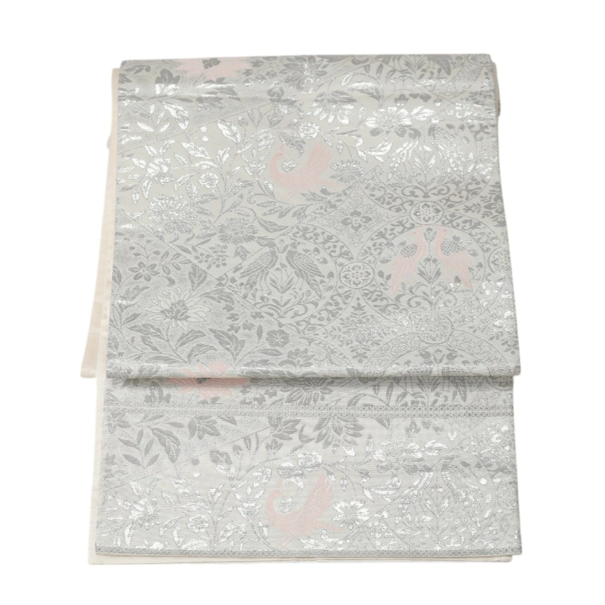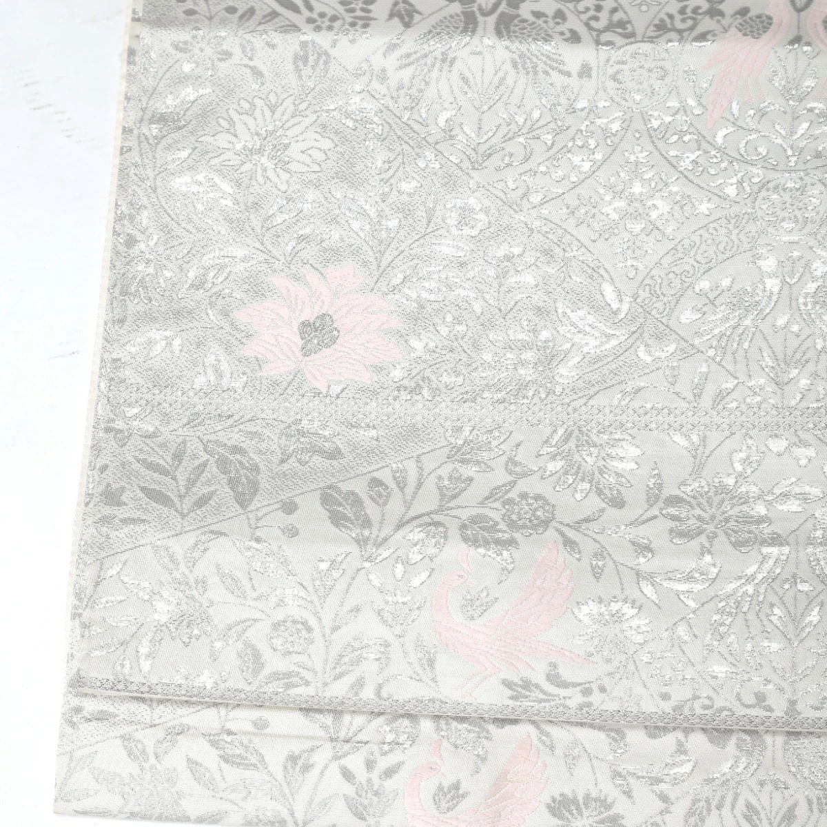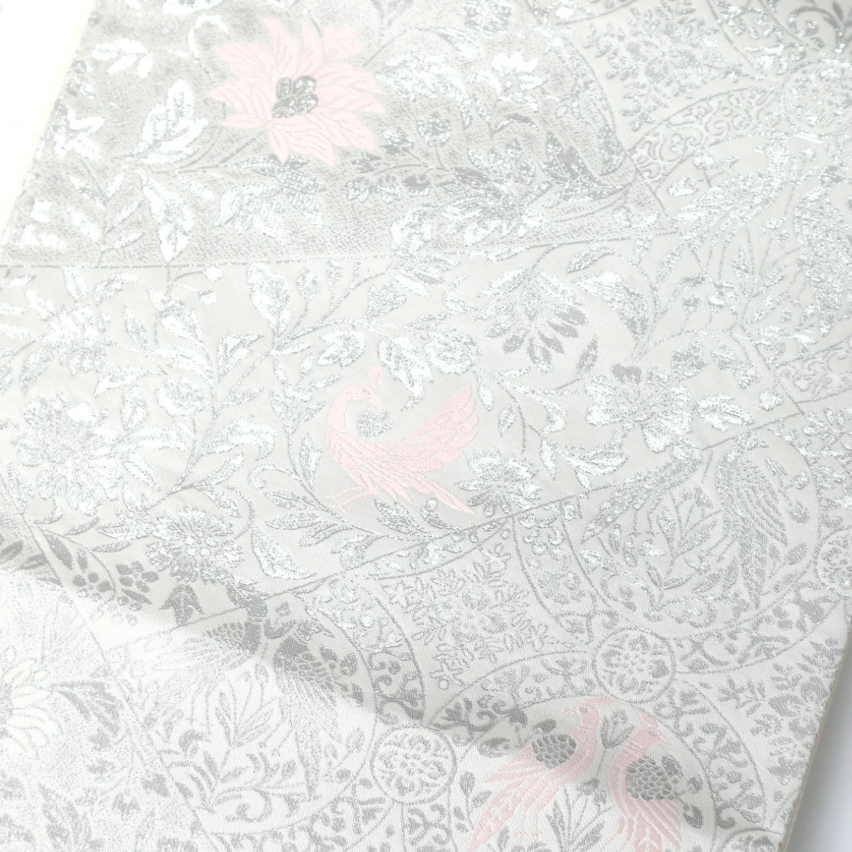 | 袋帯 正絹鳥柄 銀糸 縫い袋 六通柄レディース ピンク |