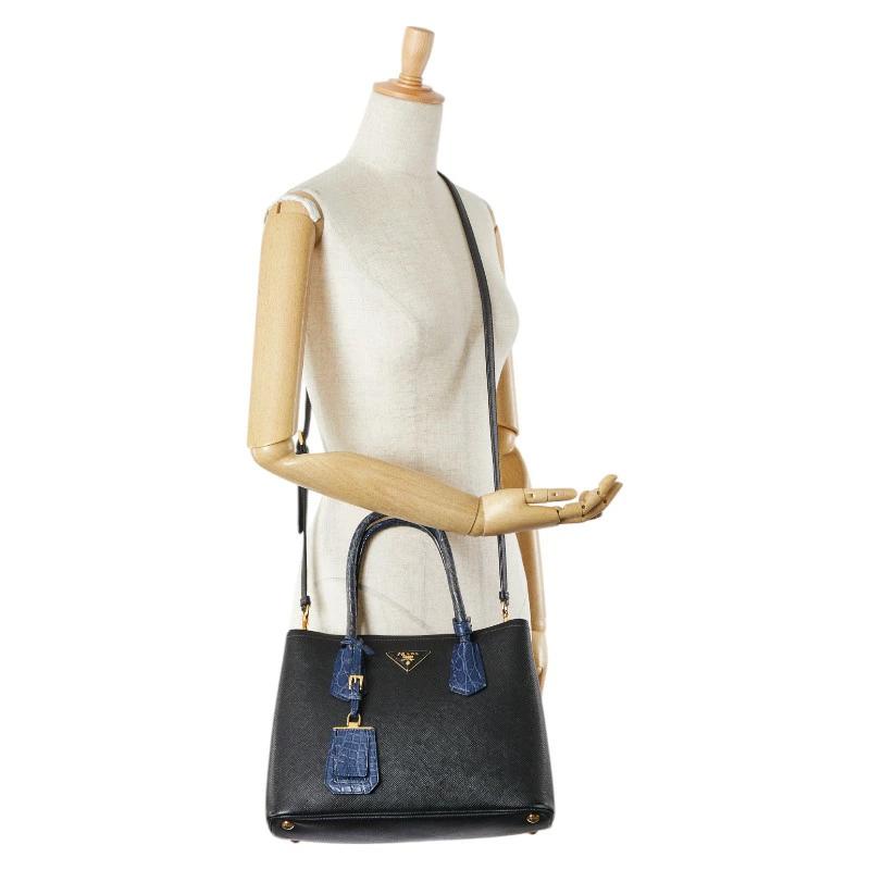 Pre-owned Prada Double Triangle Logo Plate Handbag/Shoulder Bag 1BG887 in Black/Navy Leather with Crocodile Leather.