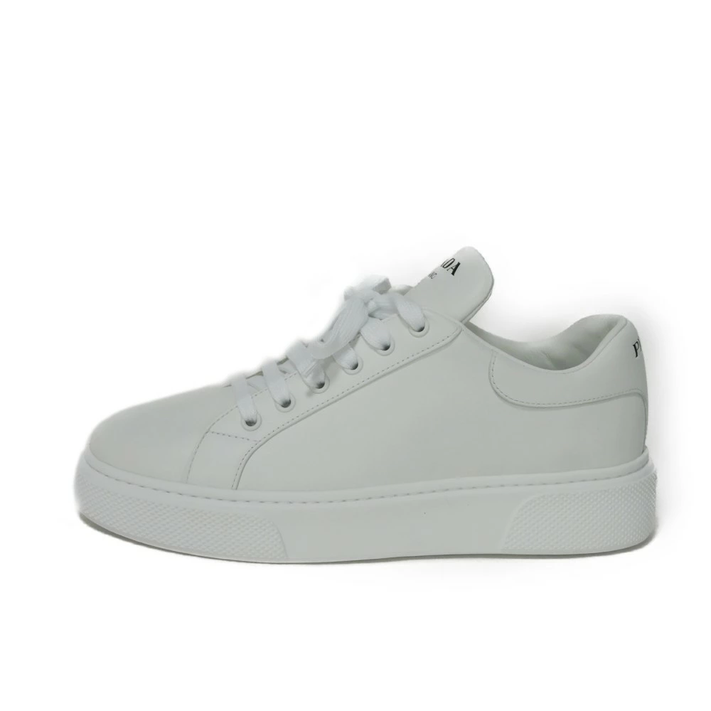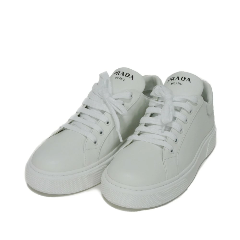 カーフレザーにプラダのロゴがエンボス加工された「ロゴ プリント ロートップ」プラットフォーム型スニーカーです。 |