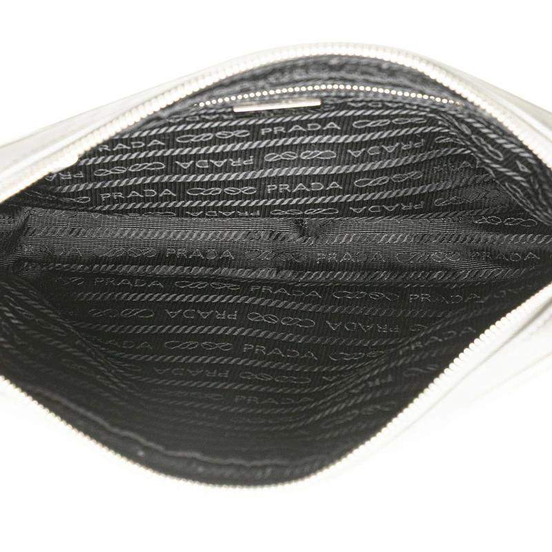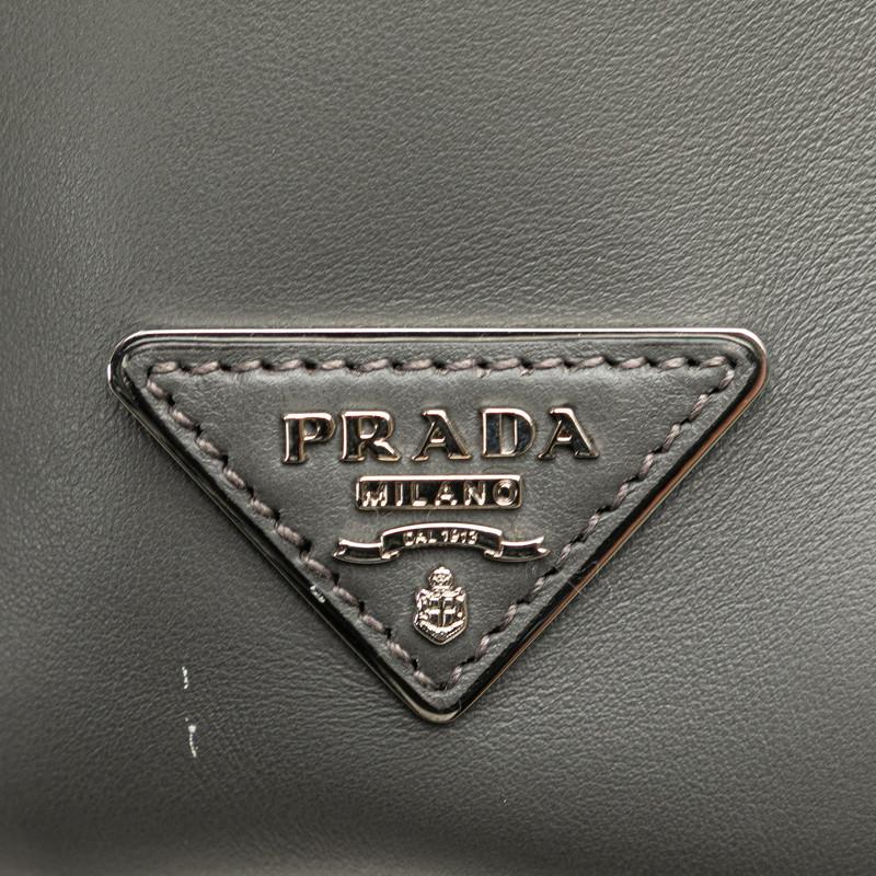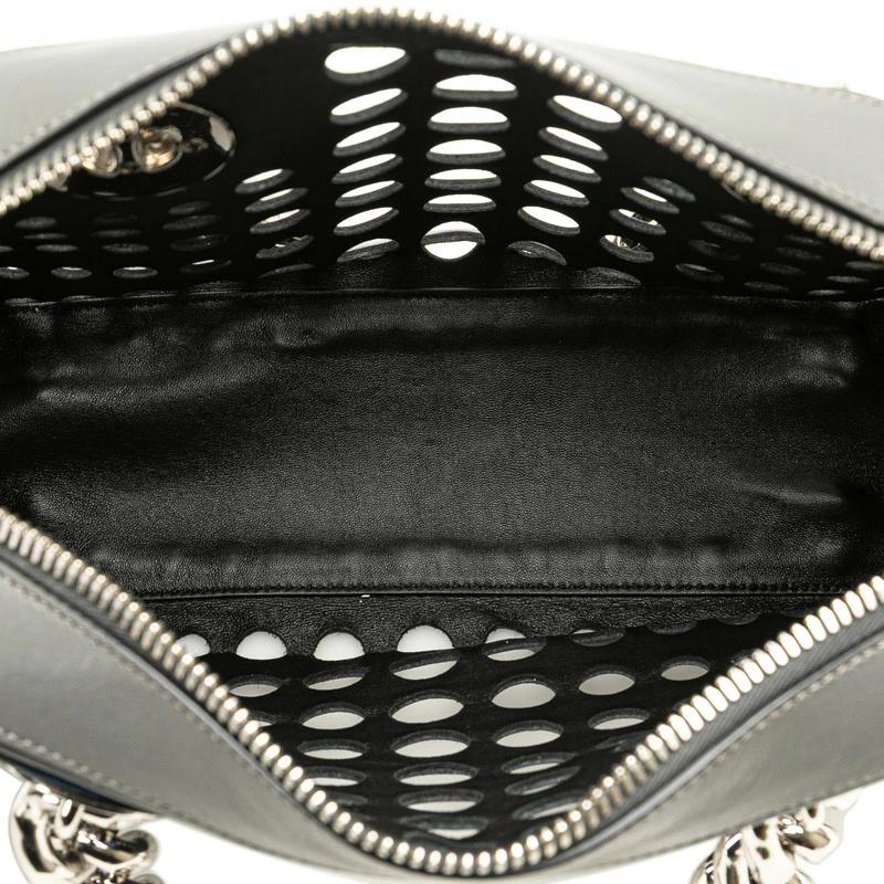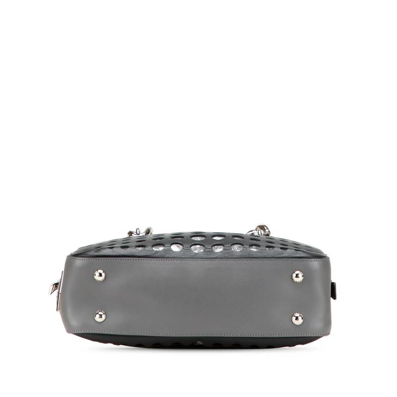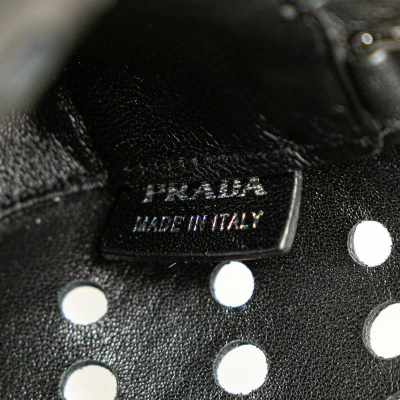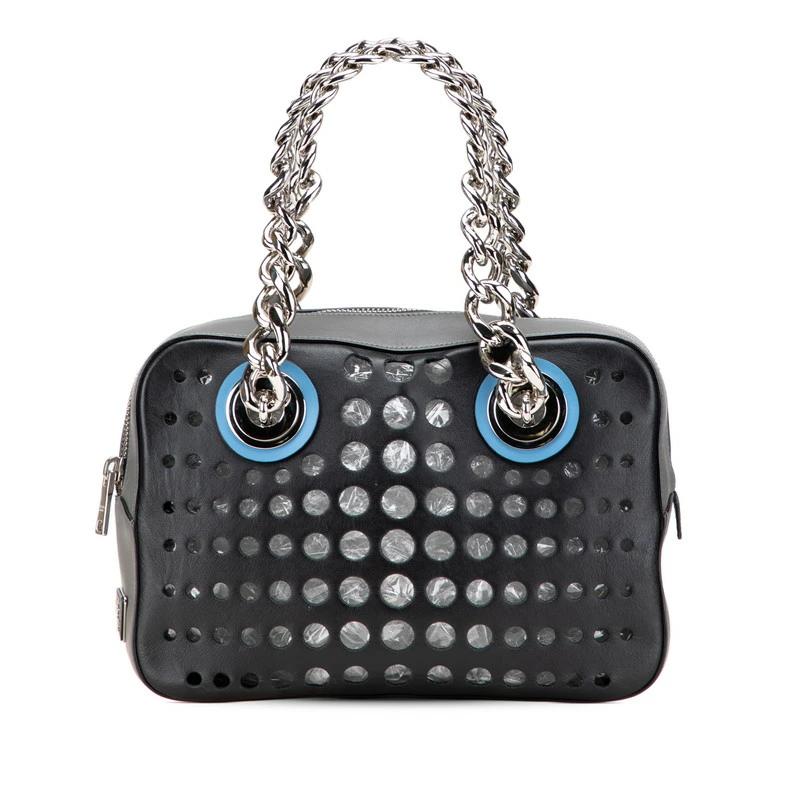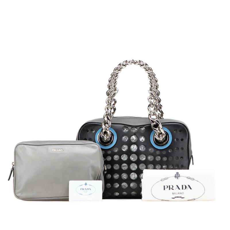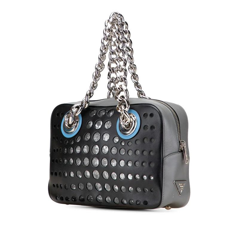 Pre-owned Prada Triangle Logo Plate Perforated Chain Tote Bag, Handbag 1BB017, Black/Grey Leather, Women's.