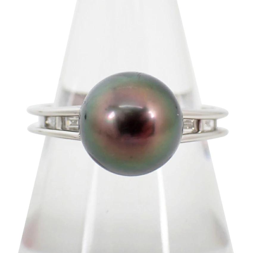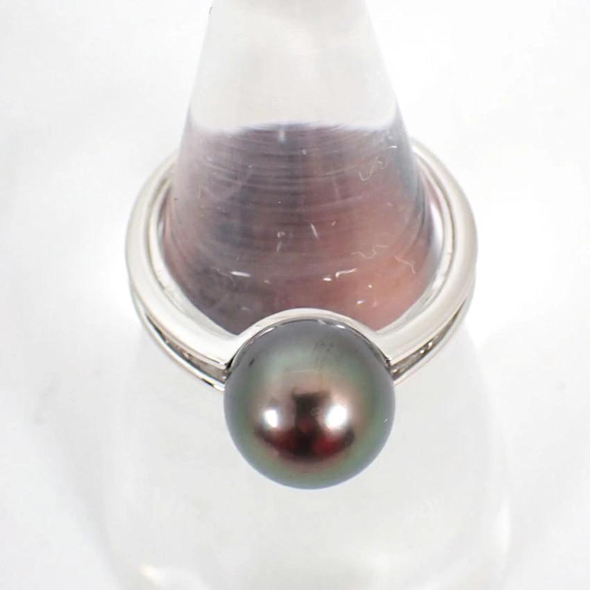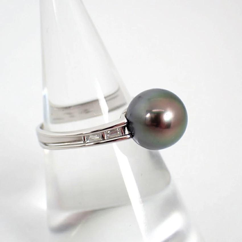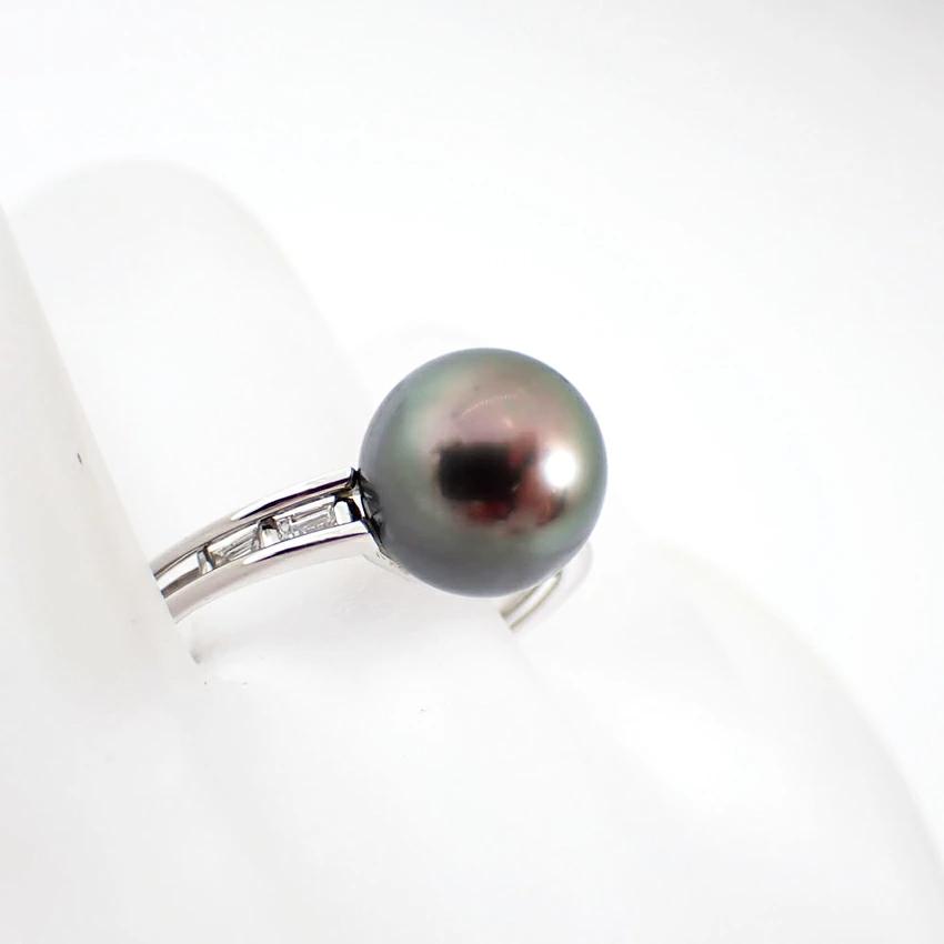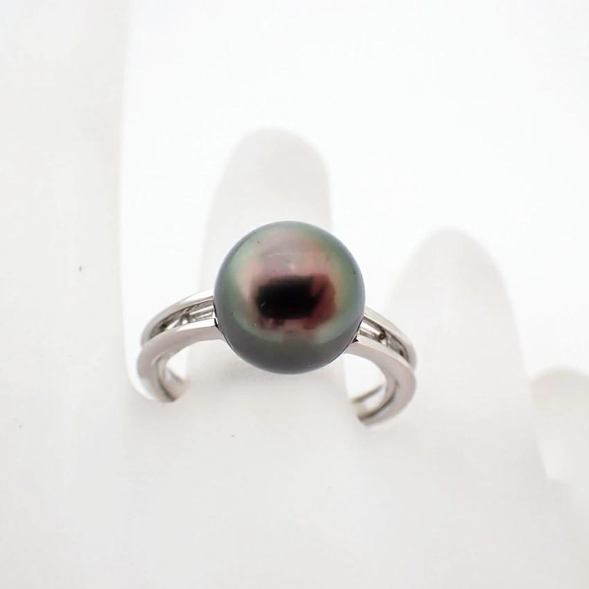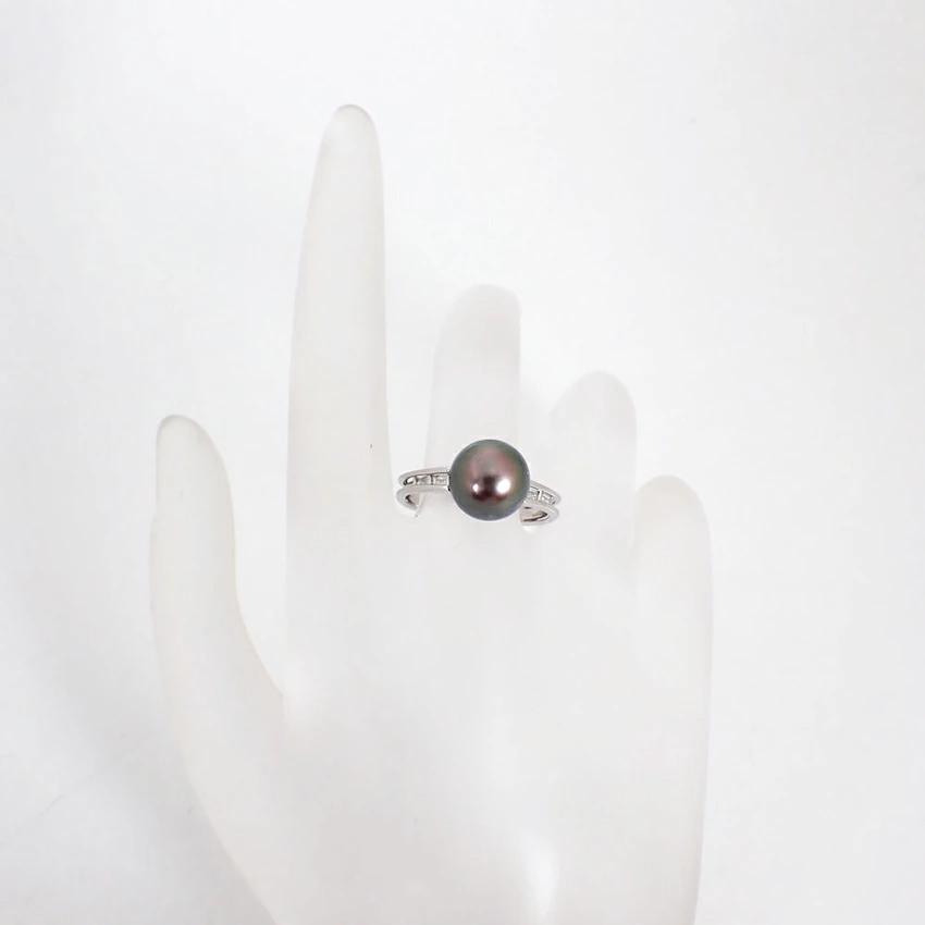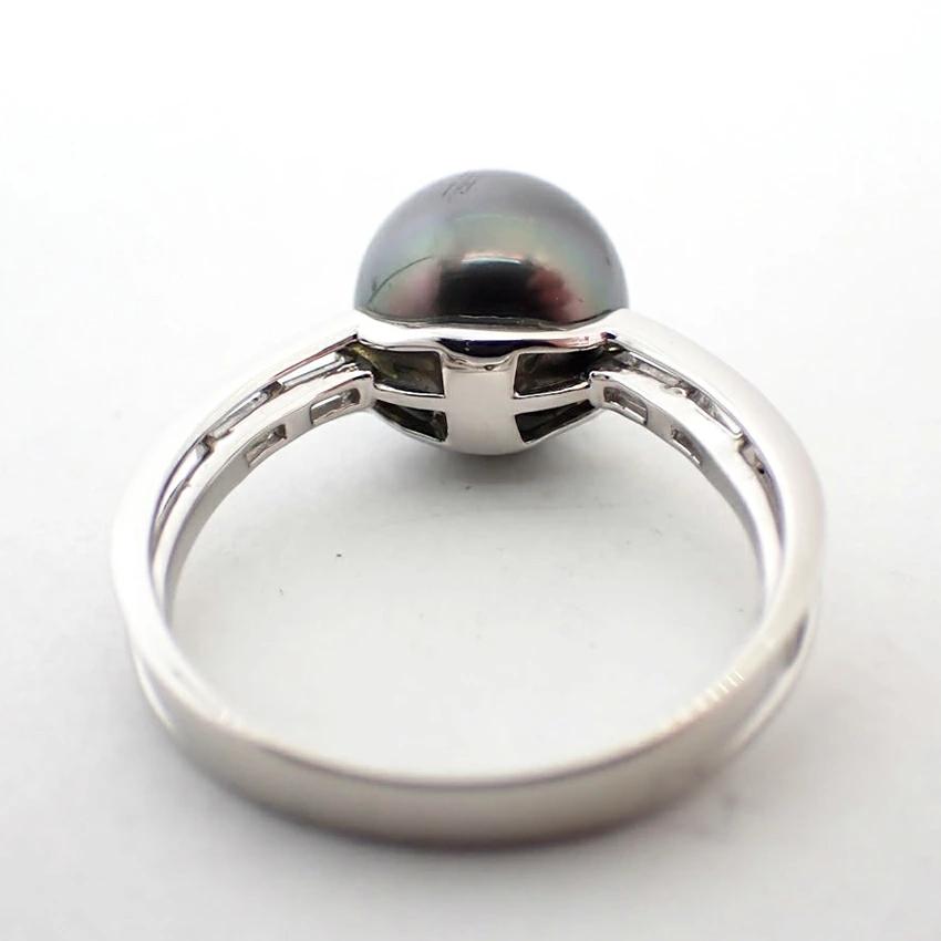 This elegant ring features a beautiful, lustrous black pearl set with a brilliant diamond.