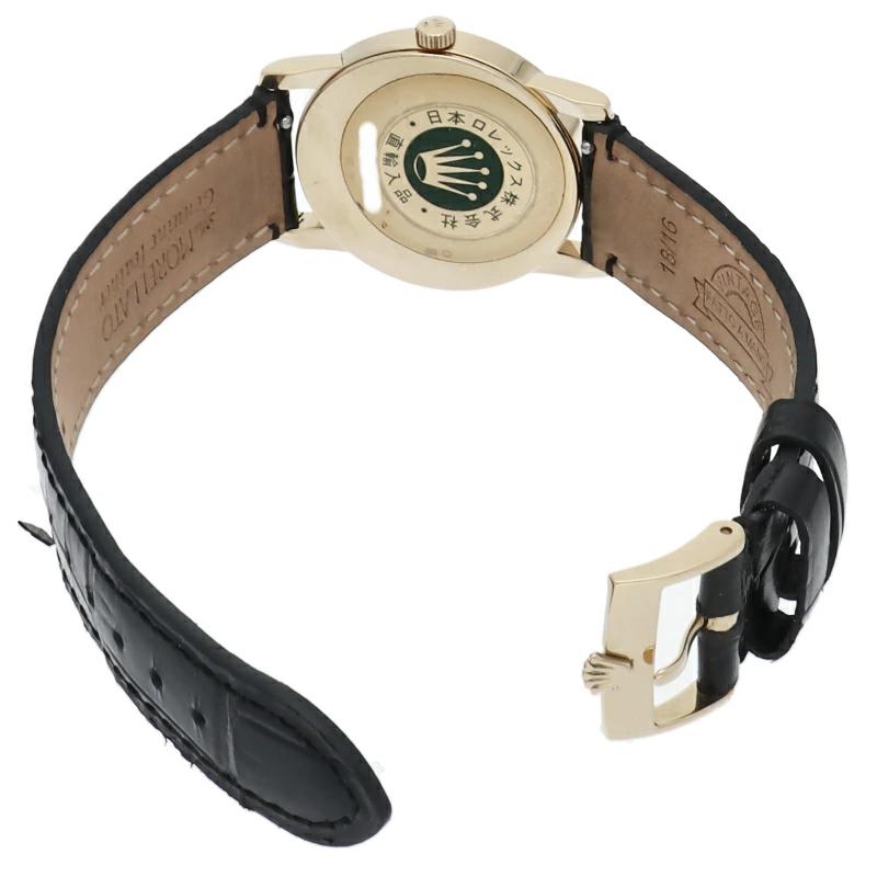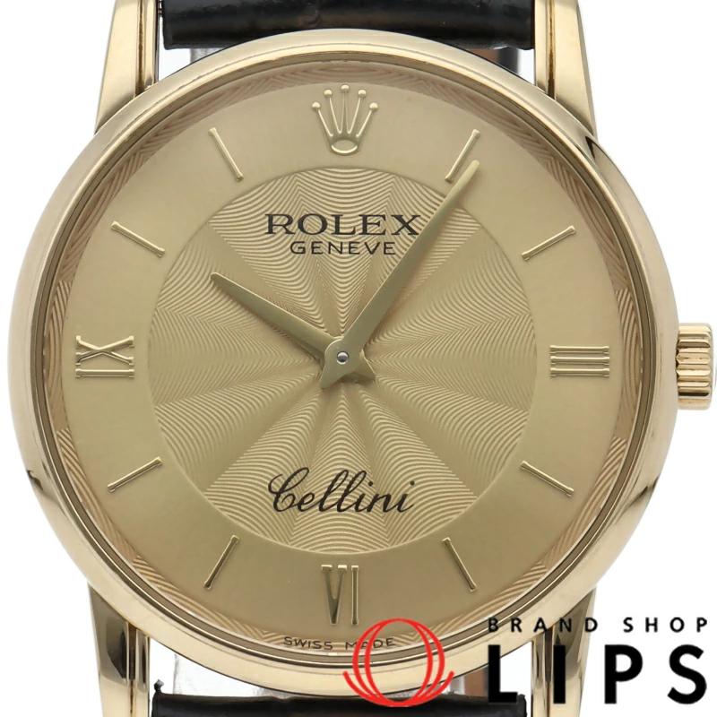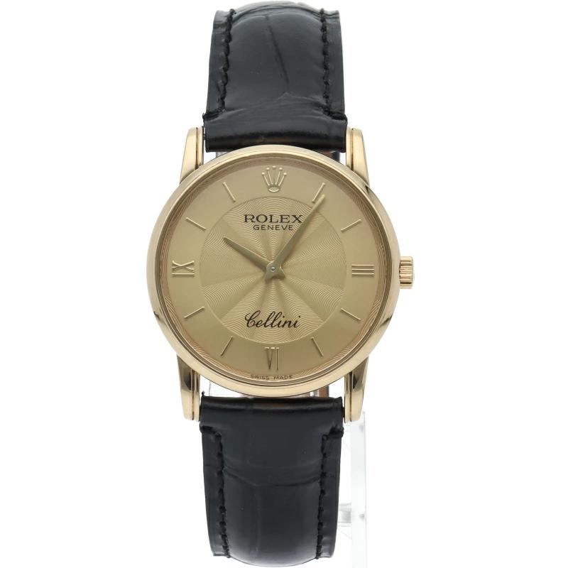 | ロレックスの正統派ドレスライン「チェリーニ」Ref.5116。18Kイエローゴールドケースに同色のシャンパン文字盤を合わせ、黄金色の輝きで統一された気品あふれる一本です。装飾を極限まで抑えたバーインデックスが、シンプルながらも洗練された美しさを強調。薄型の手巻きモデルとして、フォーマルな装いを格上げする至高のタイムピースです。 |