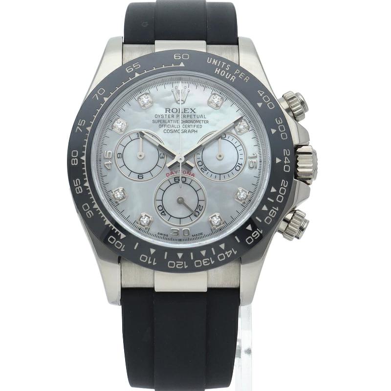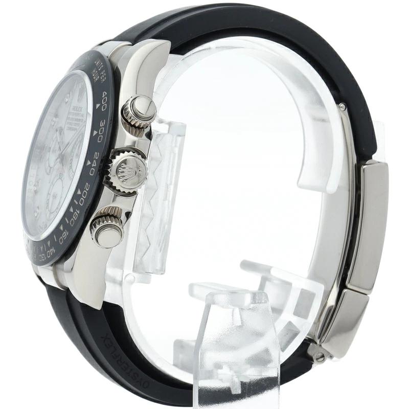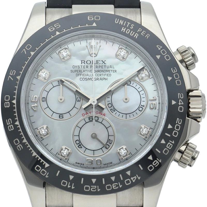 Pre-owned Rolex Cosmograph Daytona Watch (116519LNNG) with 8 Diamonds and White Shell Case, 18K White Gold/Rubber, Men's Watch, Box and Warranty.