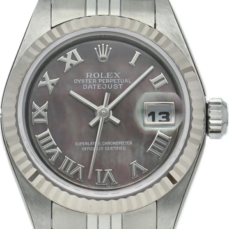 | ロレックスのドレスウォッチで幅広い年齢層に愛されているデイトジャスト。ホワイトゴールドとステンレスのコンビ仕様にブラックシェルの文字盤が映えて豪華です。 |