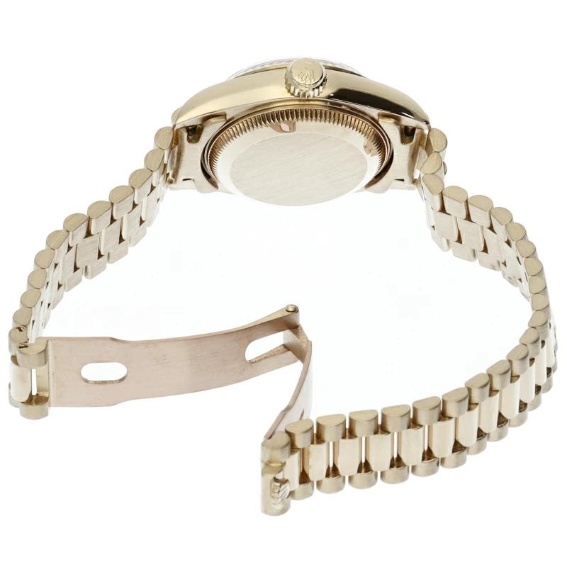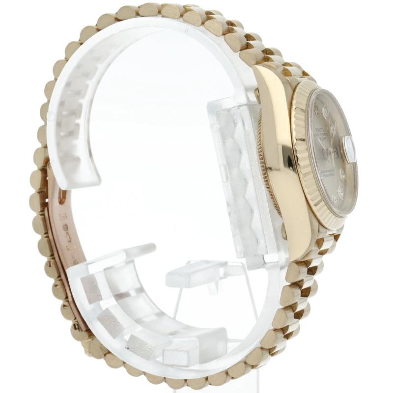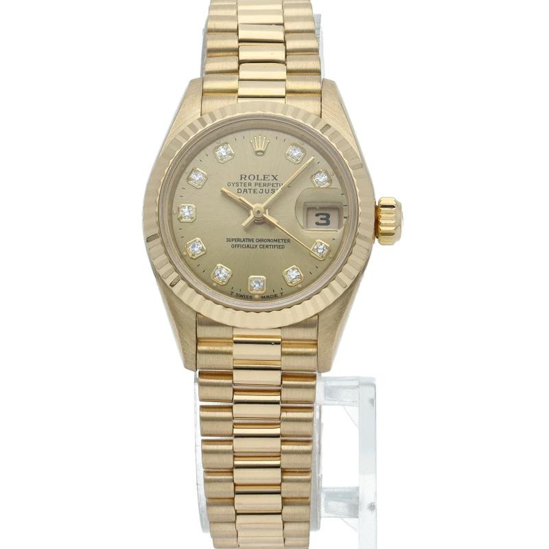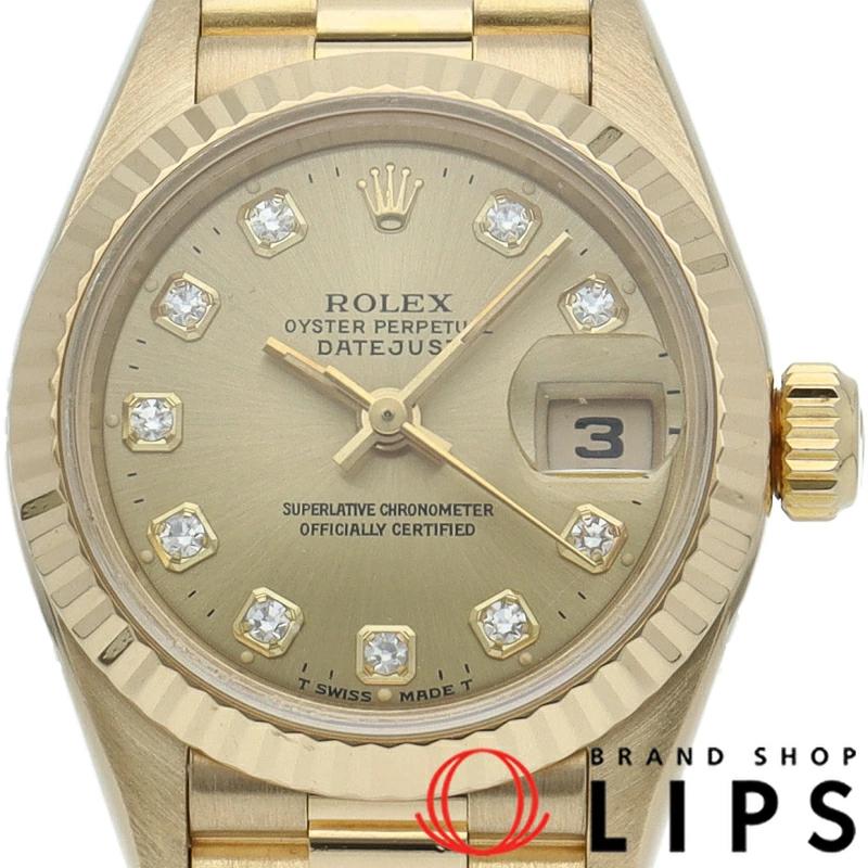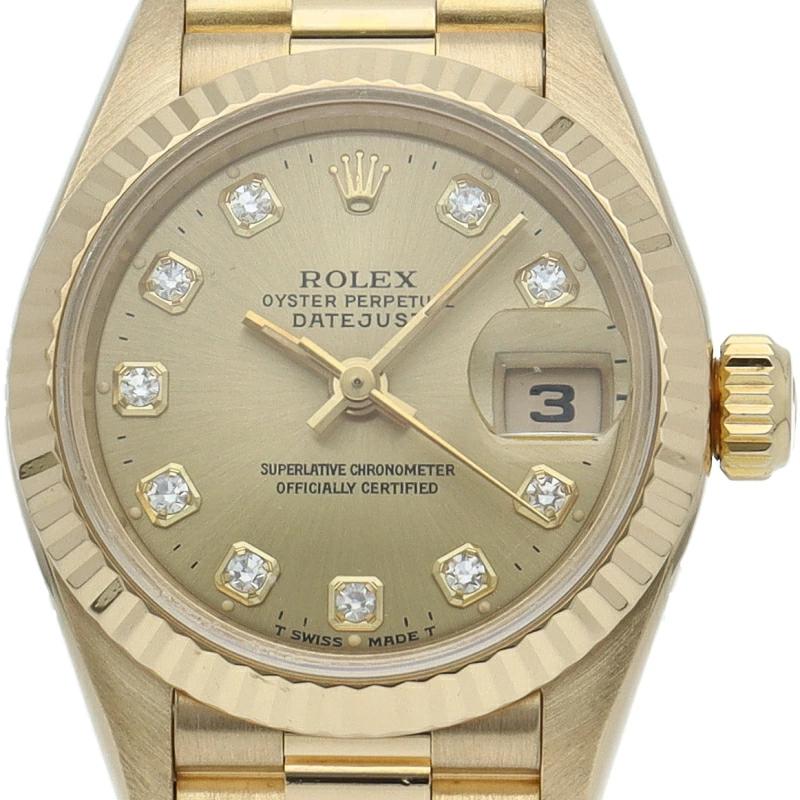 | ロレックスのドレスウォッチで幅広い年齢層に愛されているデイトジャスト。イエローゴールドのケース、シャンパン文字盤に10Pダイヤが施され豪華です。 |