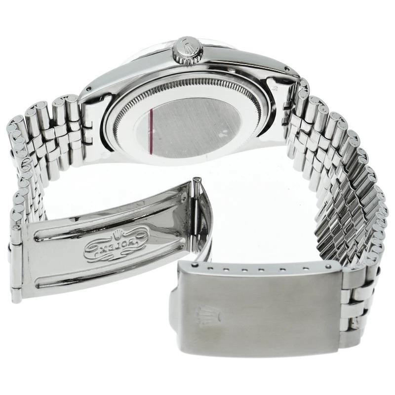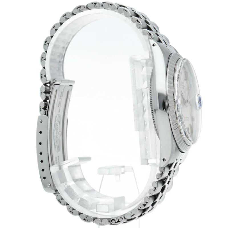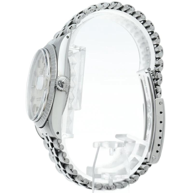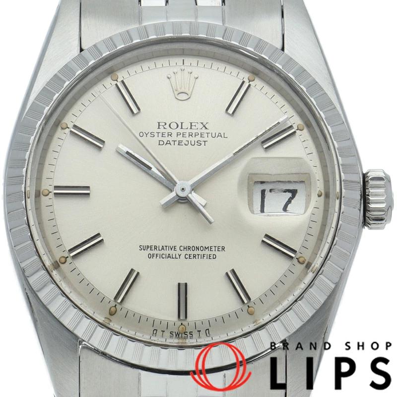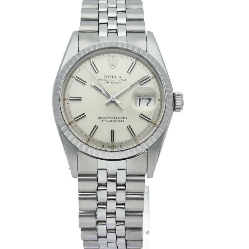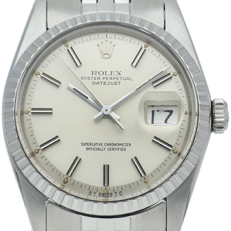| ロレックスのドレスウォッチの王道「デイトジャスト」。エンジンターンドベゼルのアンティーク感が逆に新鮮な1本。プラスチック風防仕様。こちらはワイドボーイ、通常よりも幅の広い針とインデックスが通称「Fat boy」とも呼ばれる希少文字盤です。 |