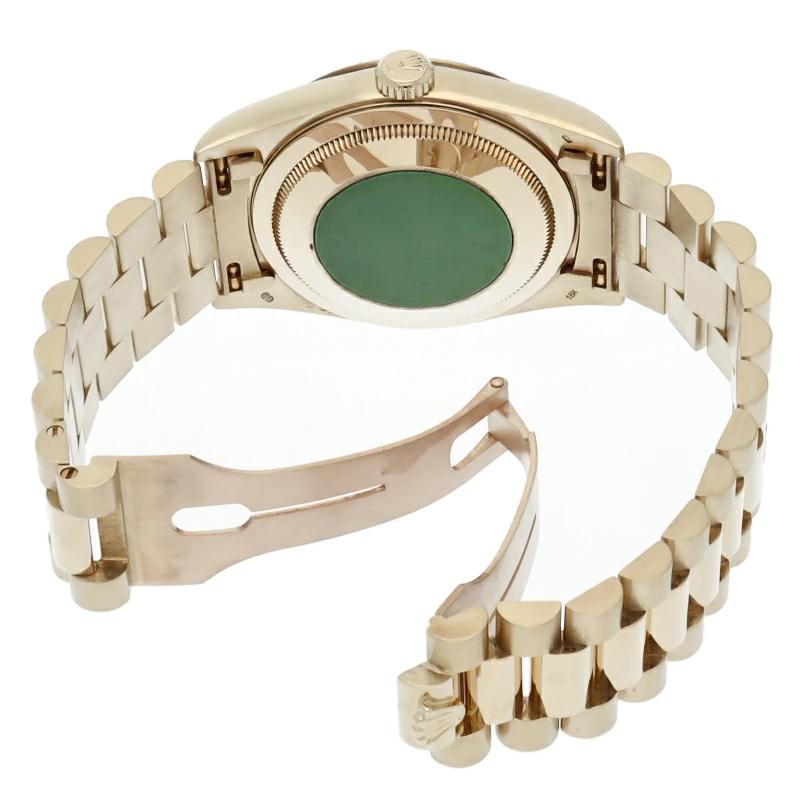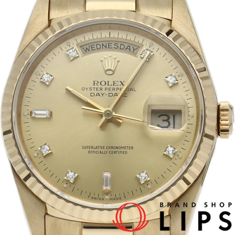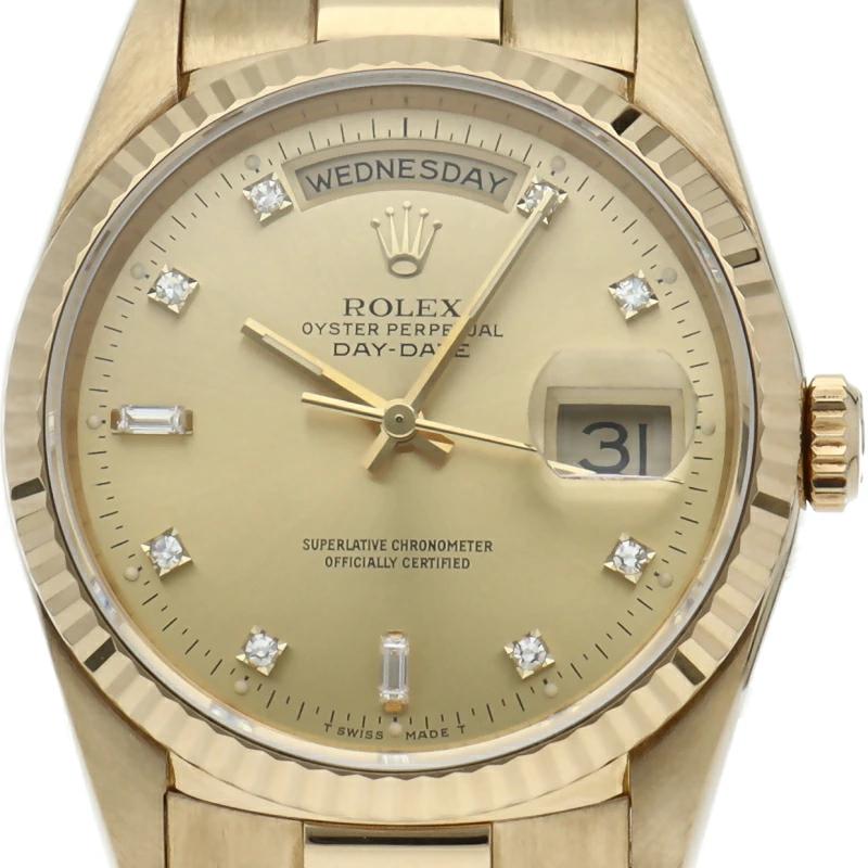 | ロレックスのドレスウォッチの最高峰「デイデイト」。イエローゴールドを贅沢に使用した高級感溢れるステータスウォッチです。文字盤には10Pダイヤ付。 |