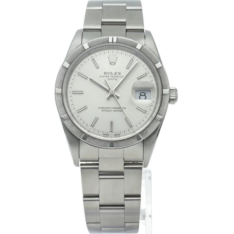 ロレックスの隠れた名作「オイスターパーペチュアルデイト」Ref.15210。最大の特徴は、航空機のエンジンを模した「エンジンターンドベゼル」です。刻まれた凹凸が渋い輝きを放ち、小傷も目立ちにくい実用的な仕様。34mmの絶妙なサイズ感と名機Cal.3135の信頼性を備え、シンプルながらも個性が光る通好みの生産終了モデルです。