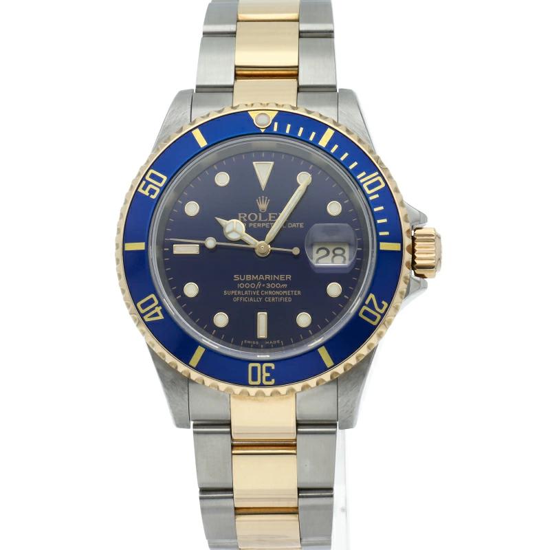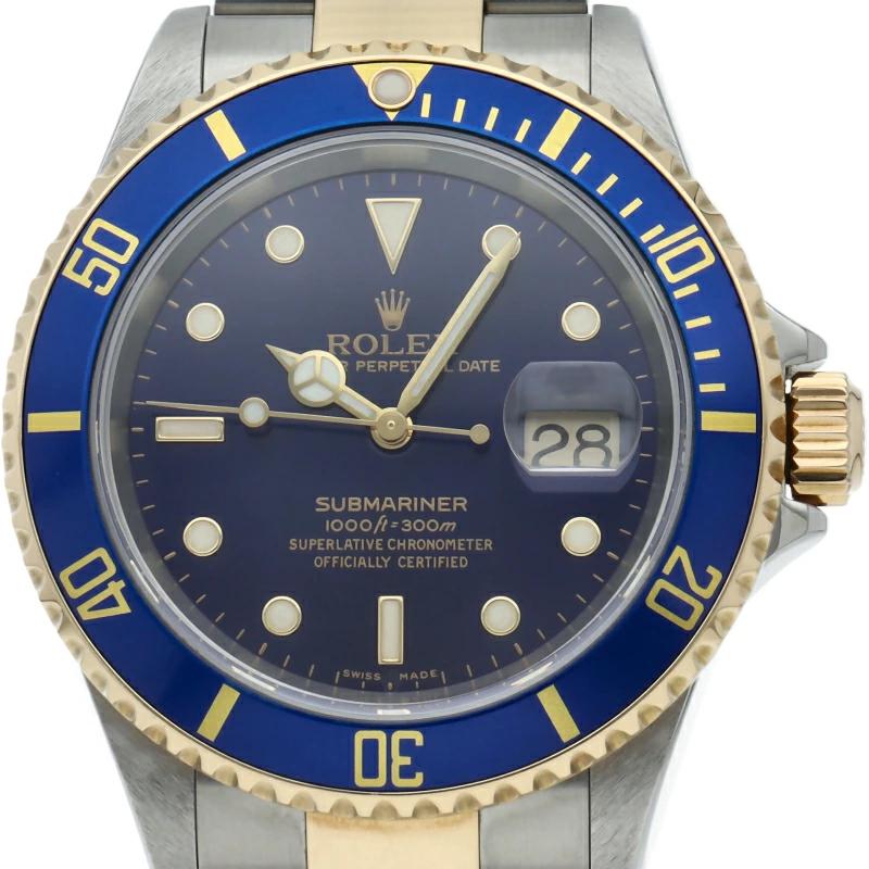 | ロレックスの中でも特に人気度の高い「サブマリーナ・デイト」のイエローゴールドとステンレスのコンビモデルで高級感溢れる1本。通称「青サブ」。 |