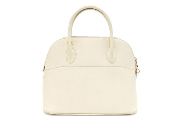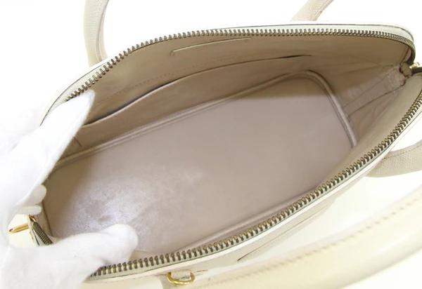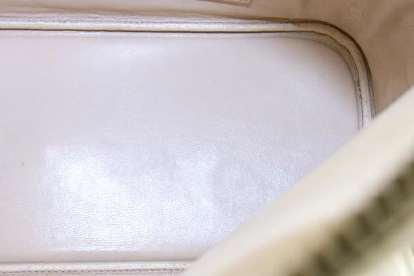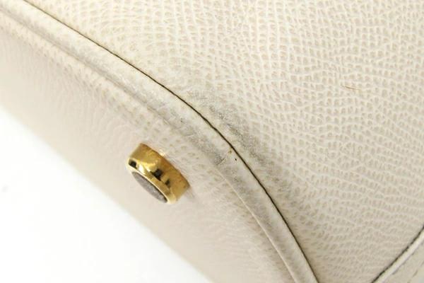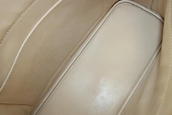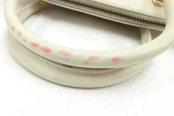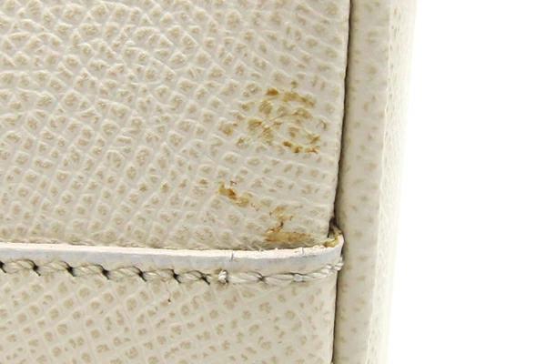 | 状態 | 外側:所々スレ・薄黒汚れ・茶系の接着剤跡汚れあり。持ち手に赤系の色移り汚れあり。底フチ周りにスレヨゴレあり。 内側:小キズ、薄汚れ、シワあり。 金具:小キズ、クスミ、変色あり。底鋲1箇所に保護取れあり。 ※内側ロゴ下に ネームタグ(MITSUKO刻印)あり。 |