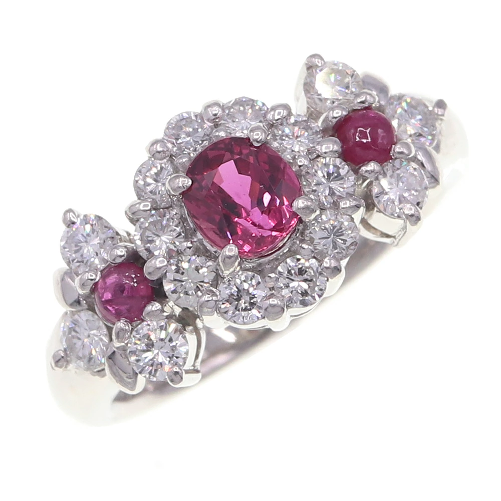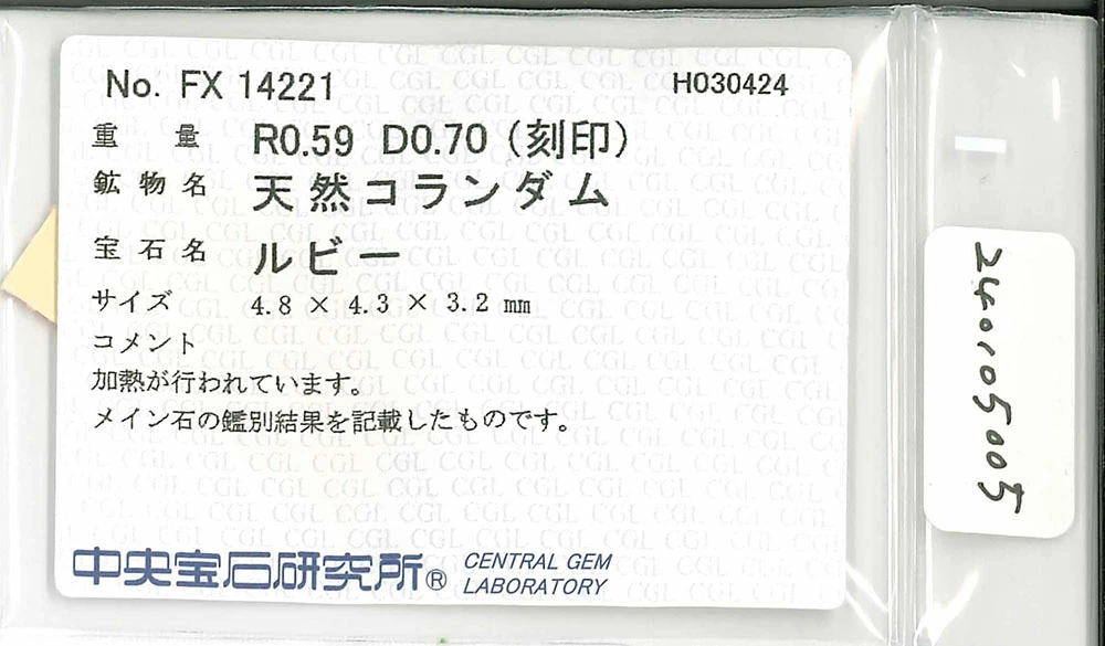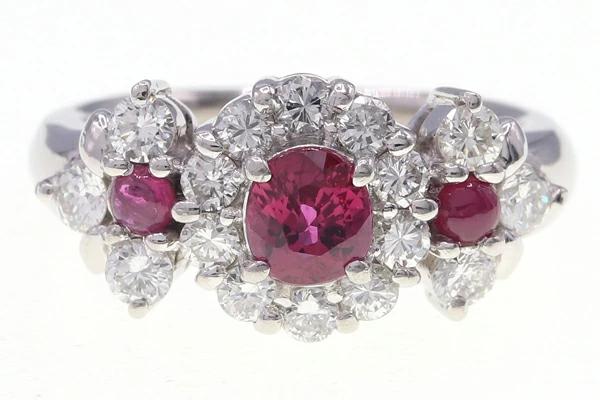 | 石目 | R0.59/D0.70 刻印 (ルビー 3石 計0.59ct×ダイヤモンド 計0.70ct) |