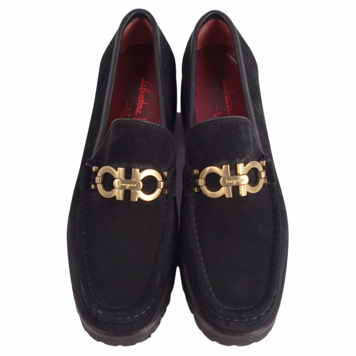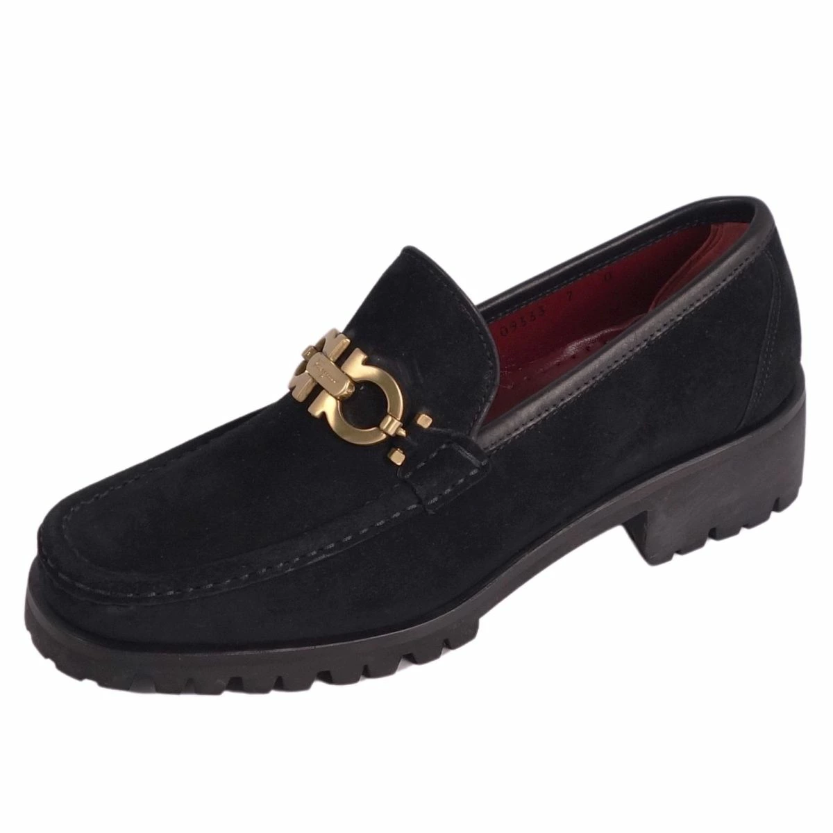 Pre-owned Salvatore Ferragamo Gancini loafers/moccasins in suede leather, made in Italy, size 7D (equivalent to 24.5cm), black. Excellent condition.