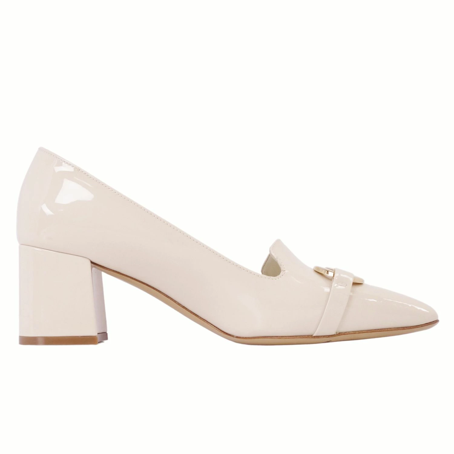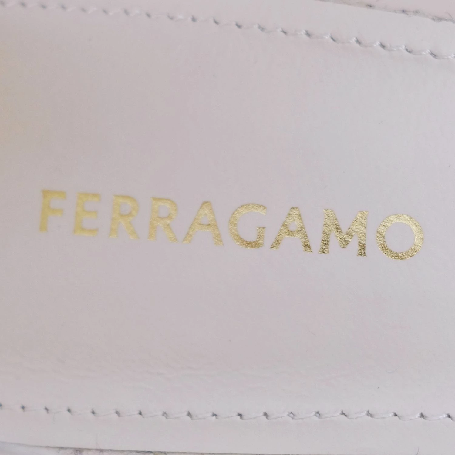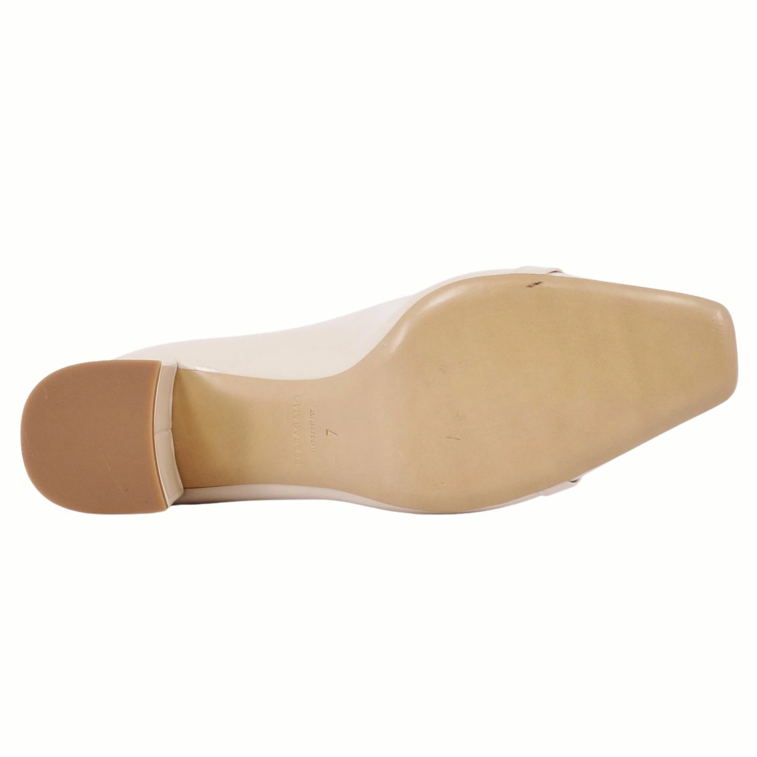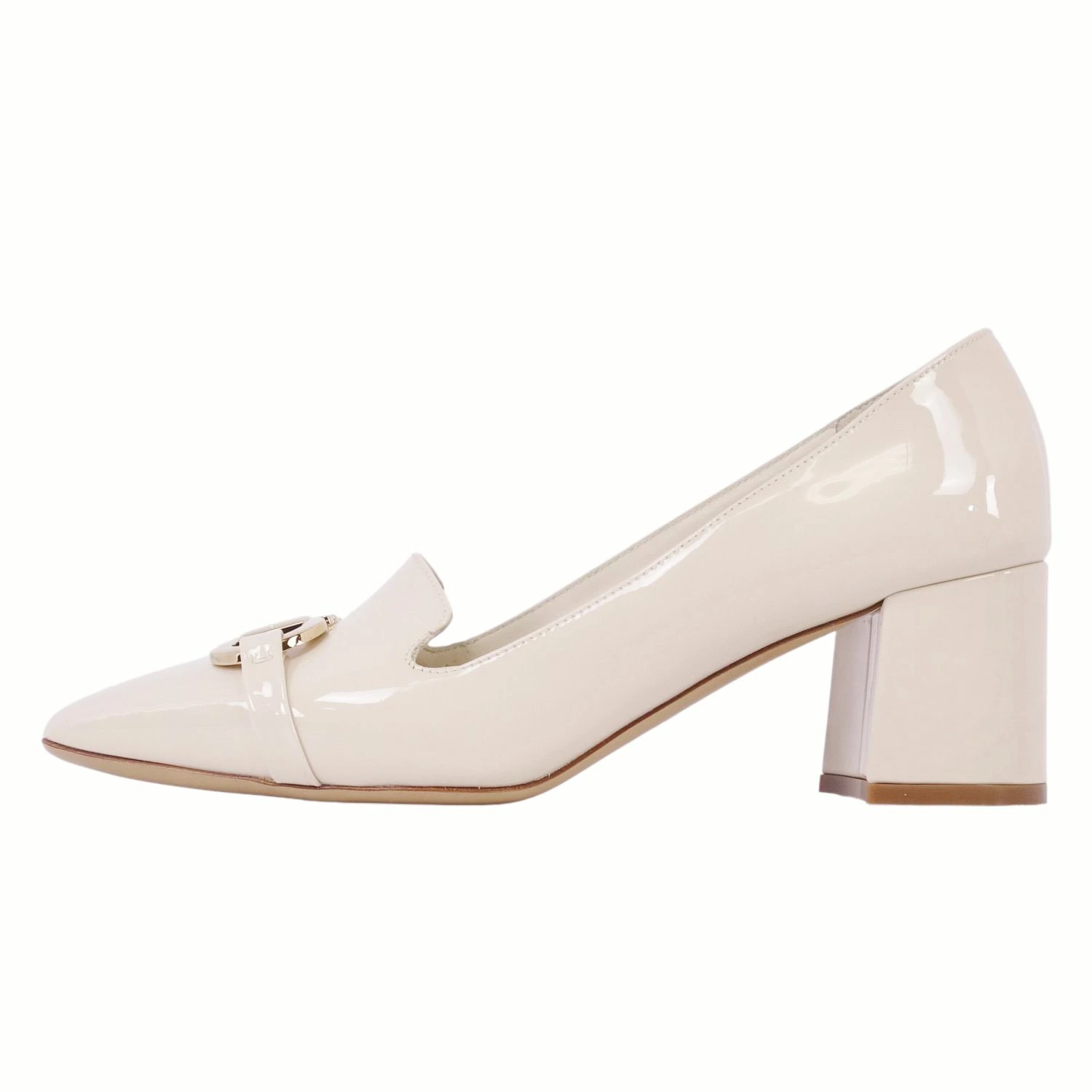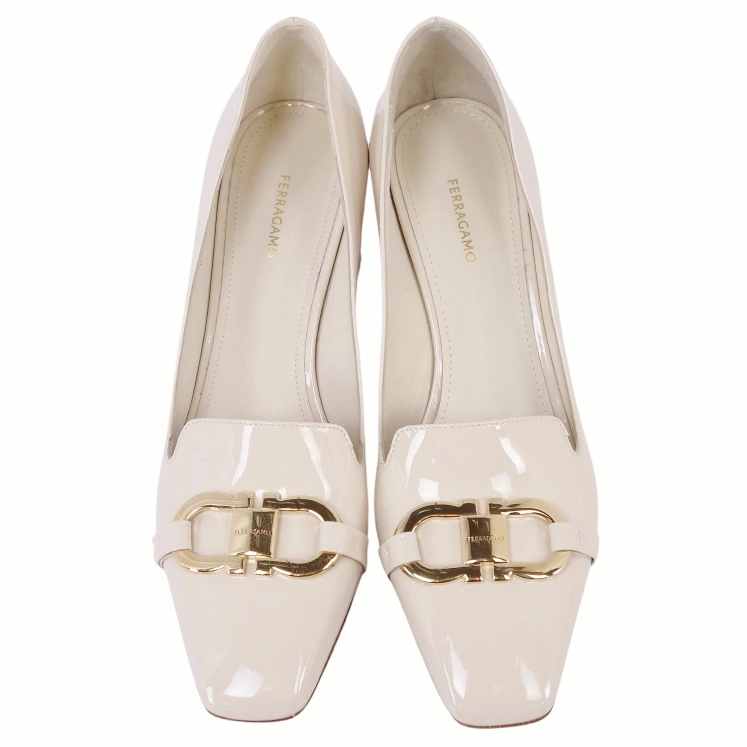 Pre-owned Salvatore Ferragamo women's ivory pumps with Gancini hardware and patent leather heels, size 7D (equivalent to 24.5cm).