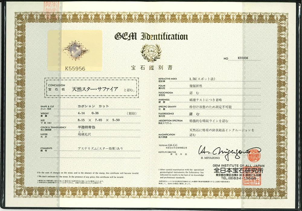 | 石目 | 4.14/0.35刻印 (スターサファイヤ 1石 4.14ct×ダイヤモンド 計0.36ct) |