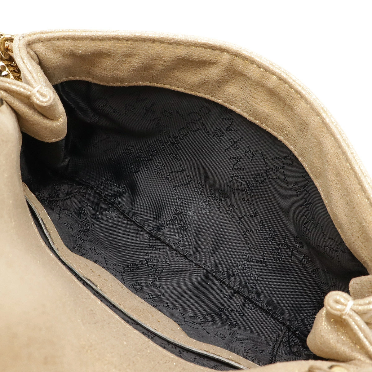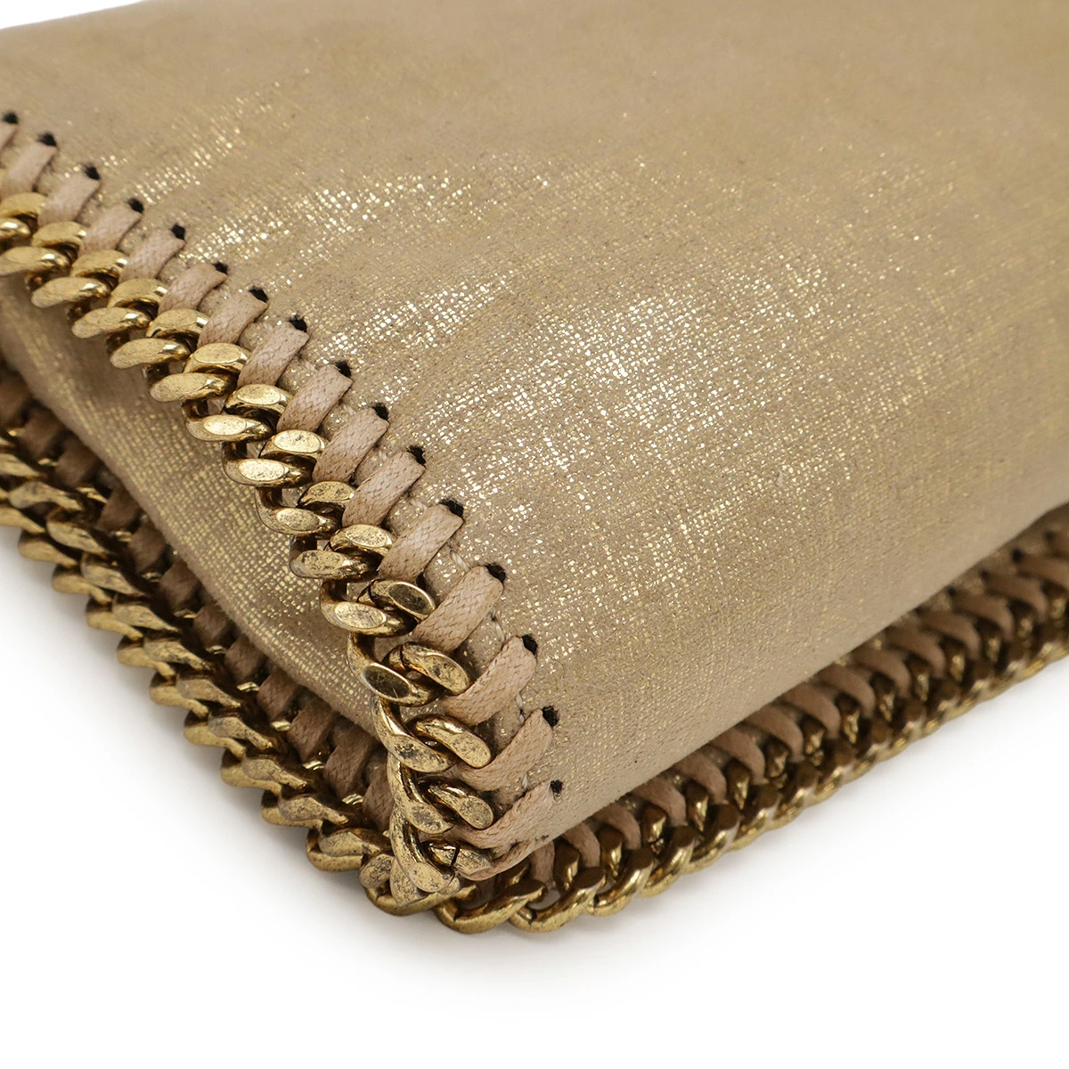 ダイヤモンドカットのルテニウムチェーンを持ち手、縁飾りにあしらったデザインがシンプルながらモード感を感じさせるデザインでございます。