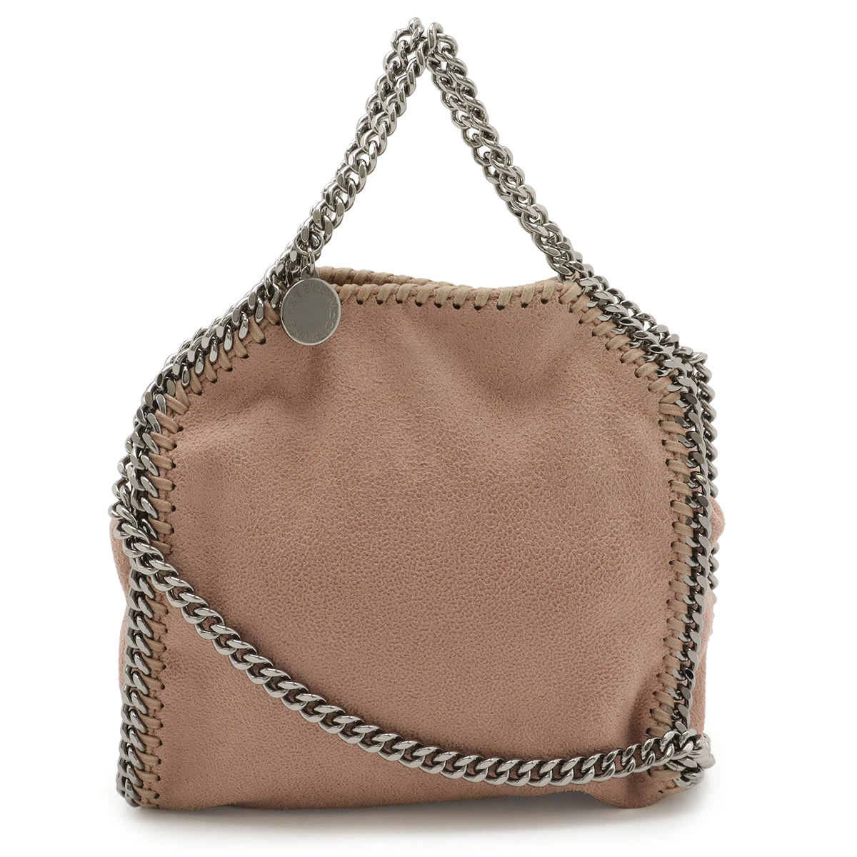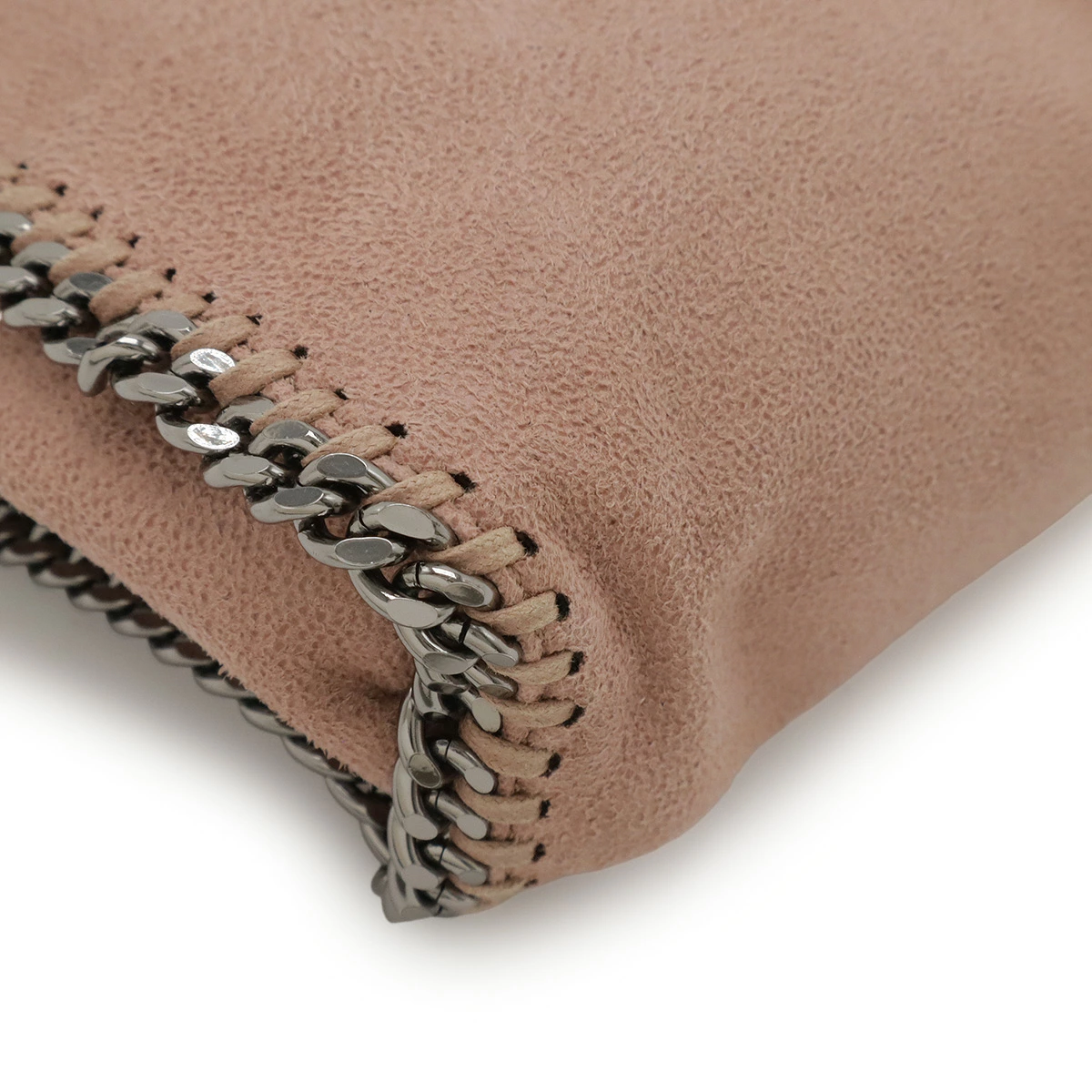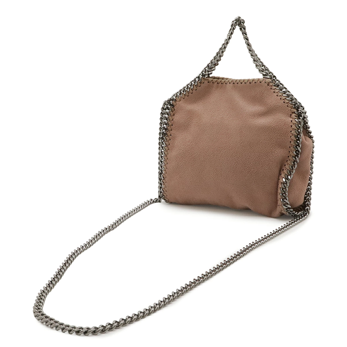 ダイヤモンドカットのルテニウムチェーンを持ち手、縁飾りにあしらったデザインがシンプルながらモード感を感じさせるデザインでございます。