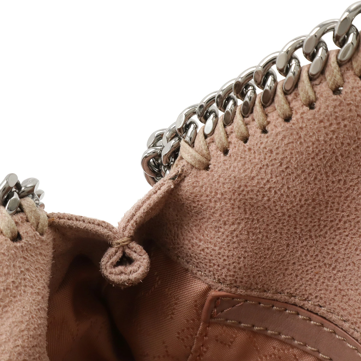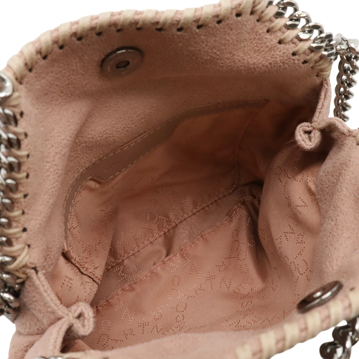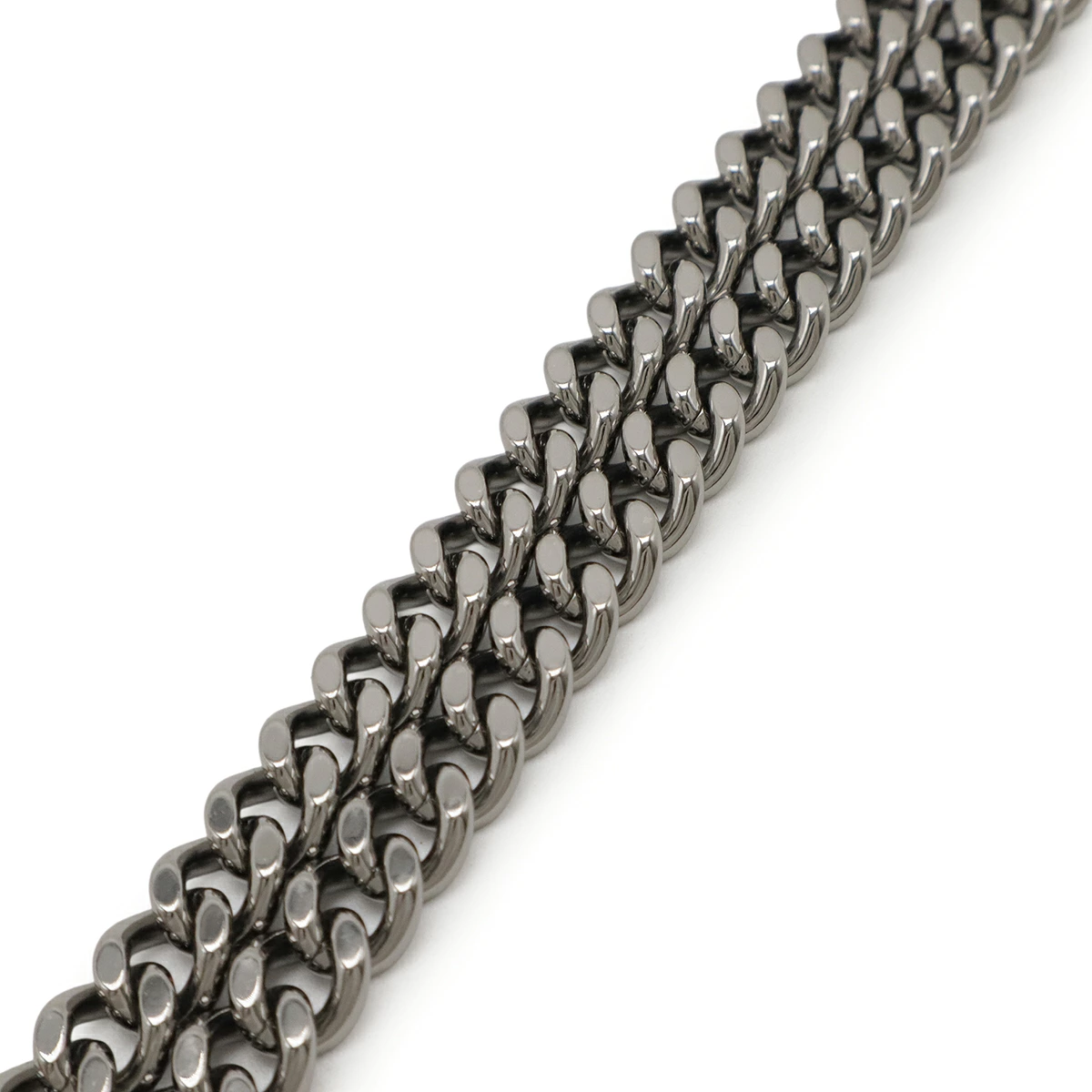 ダイヤモンドカットのルテニウムチェーンを持ち手、縁飾りにあしらったデザインがシンプルながらモード感を感じさせるデザインでございます。