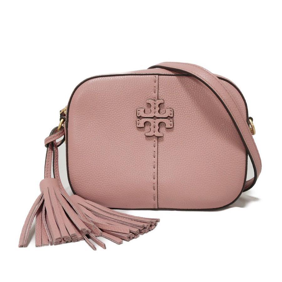 | 型押しカーフレザーにトリーバーチのダブルTロゴと手縫いのステッチがあしらわれた「マックグロー カメラバッグ」ショルダーバッグです。 |