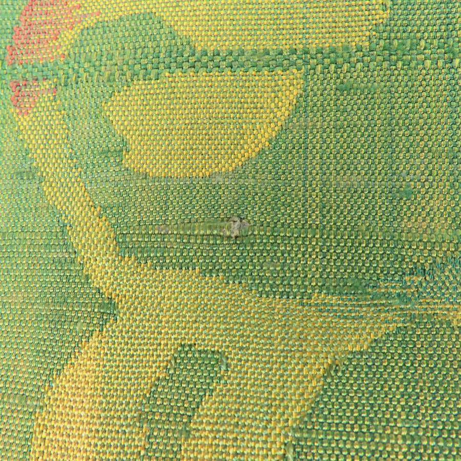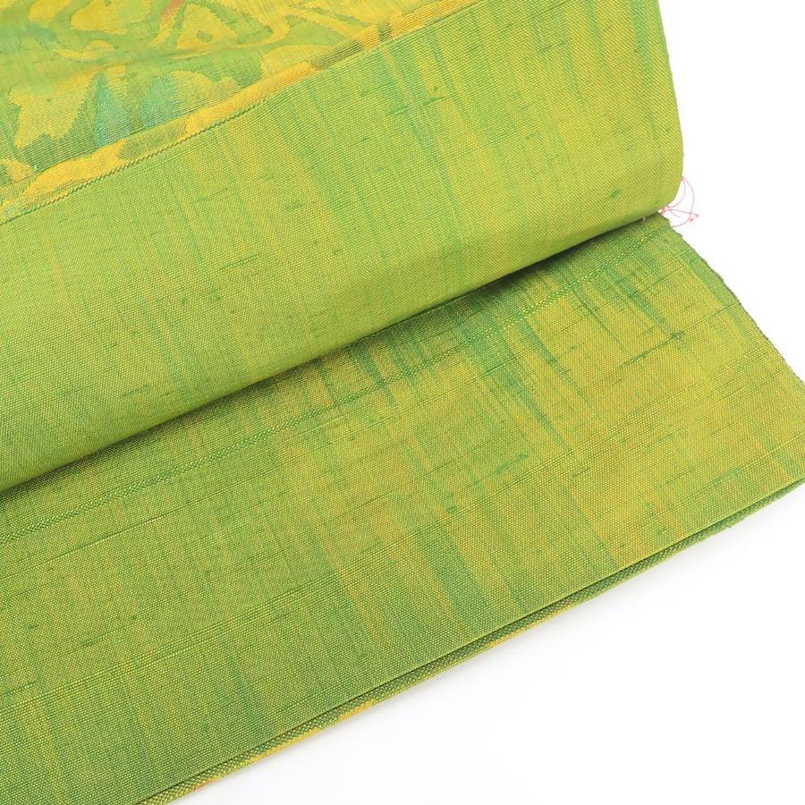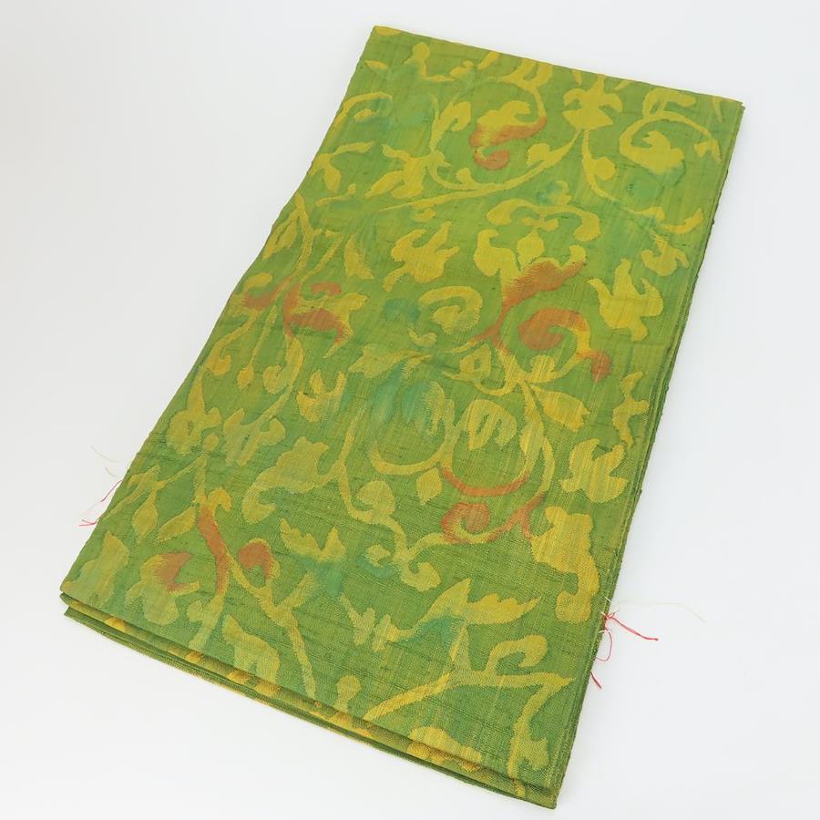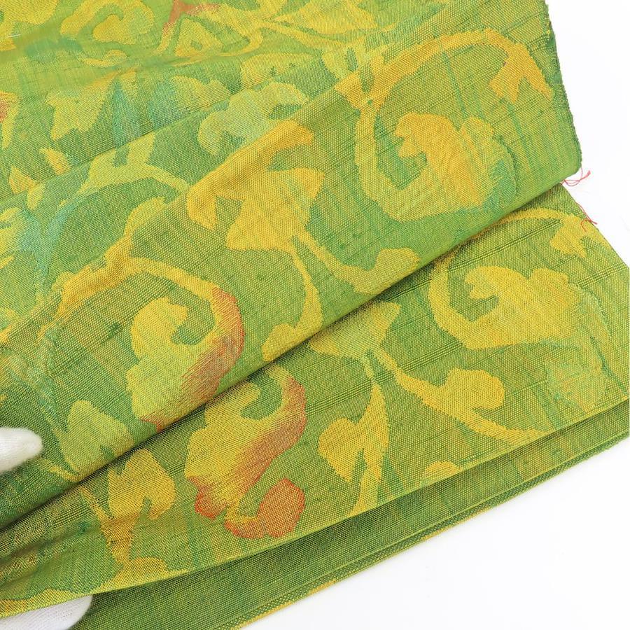 品名【中古】 袋帯 紬 しつけ糸あり 八寸 正絹(金銀糸除く) グリーン系 山吹 唐草模様 モダン お洒落 レディース 女性