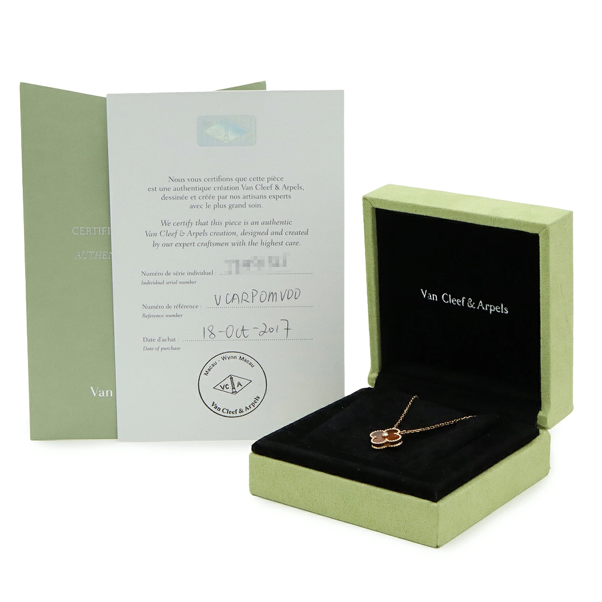美しいピンクゴールドビーズに縁取られた「ブルズアイ」クローバーが配されたペンダントは、2017年のホリデーシーズン限定アイテム。
