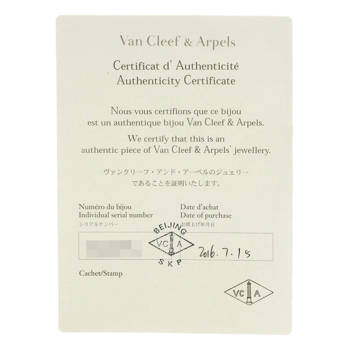 | 付属品 | ヴァンクリーフ保証書 |