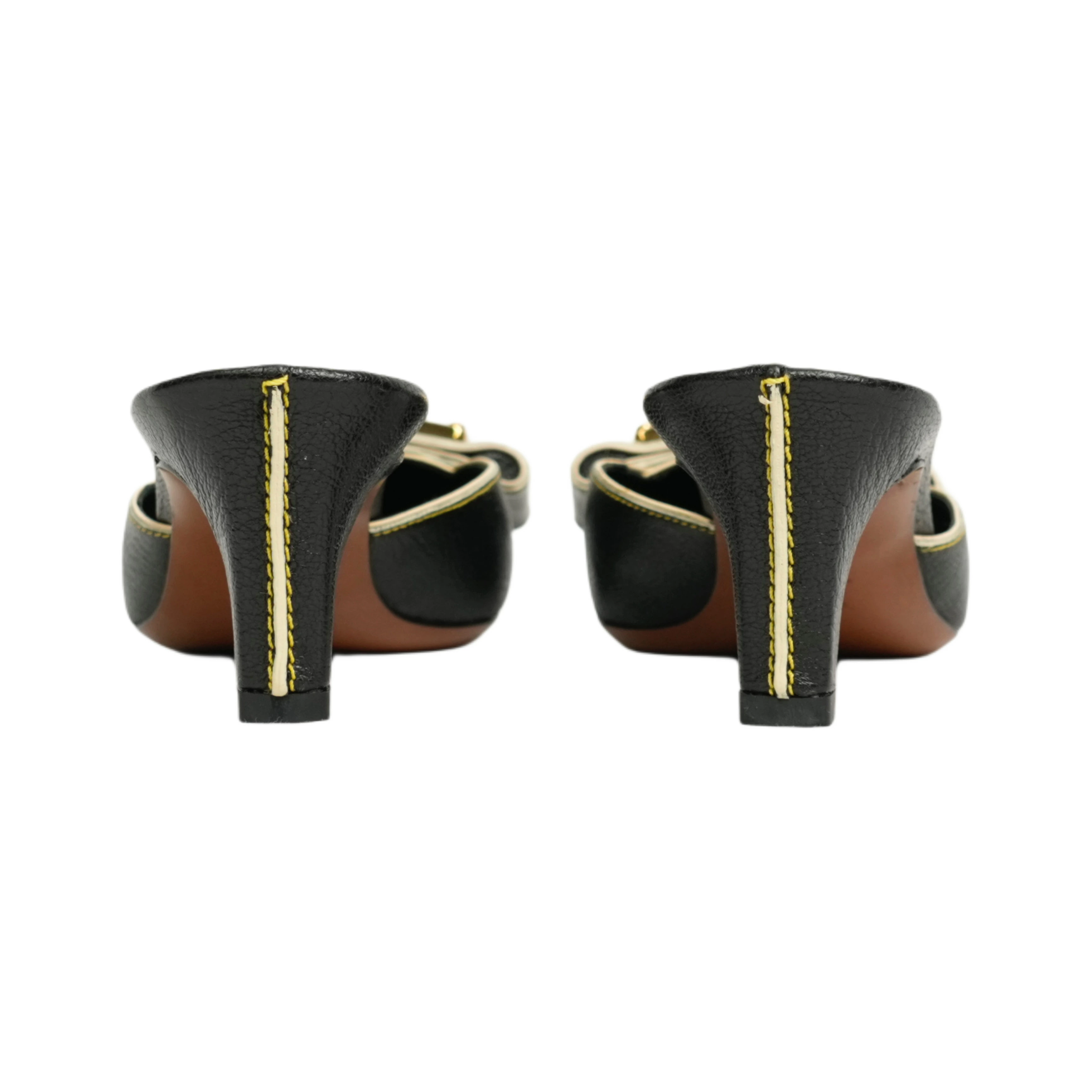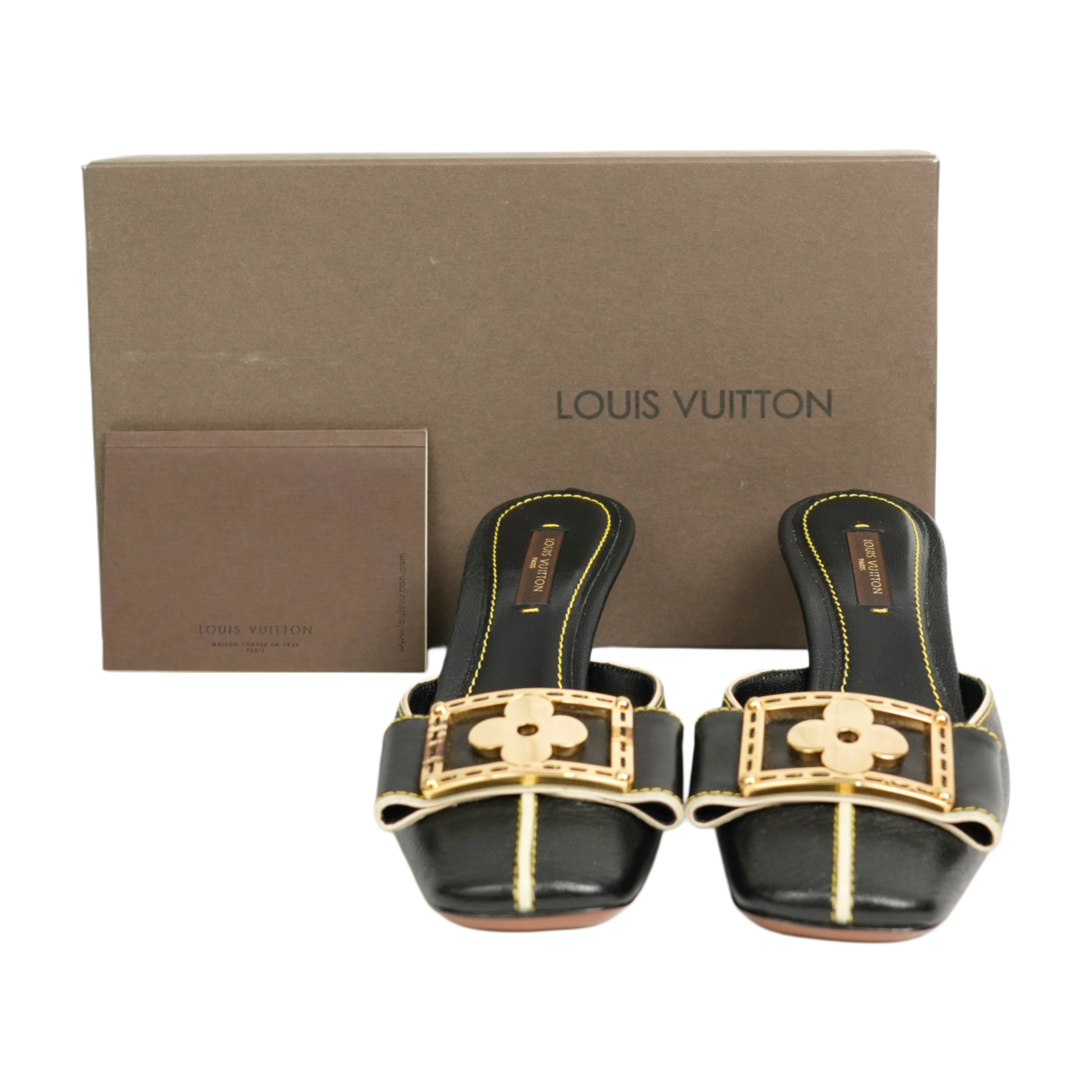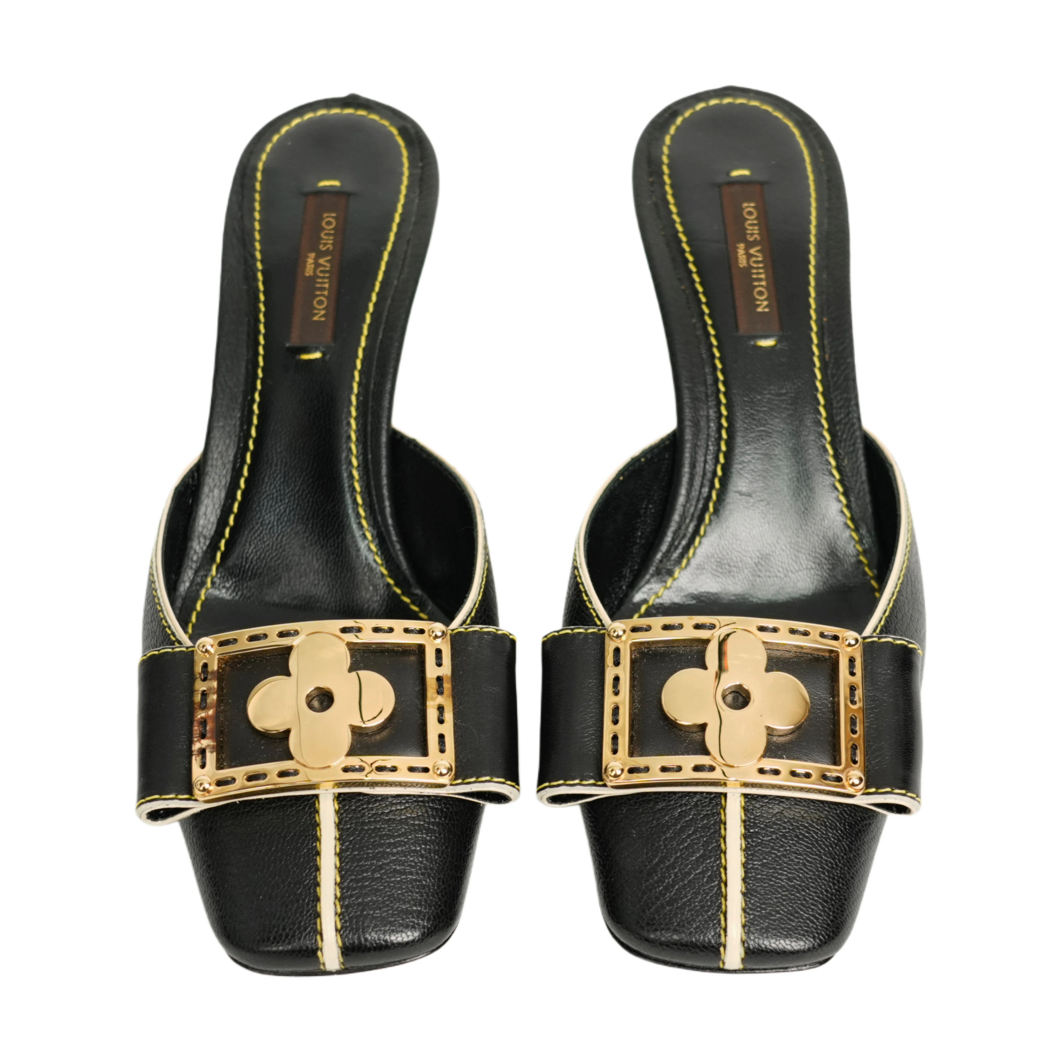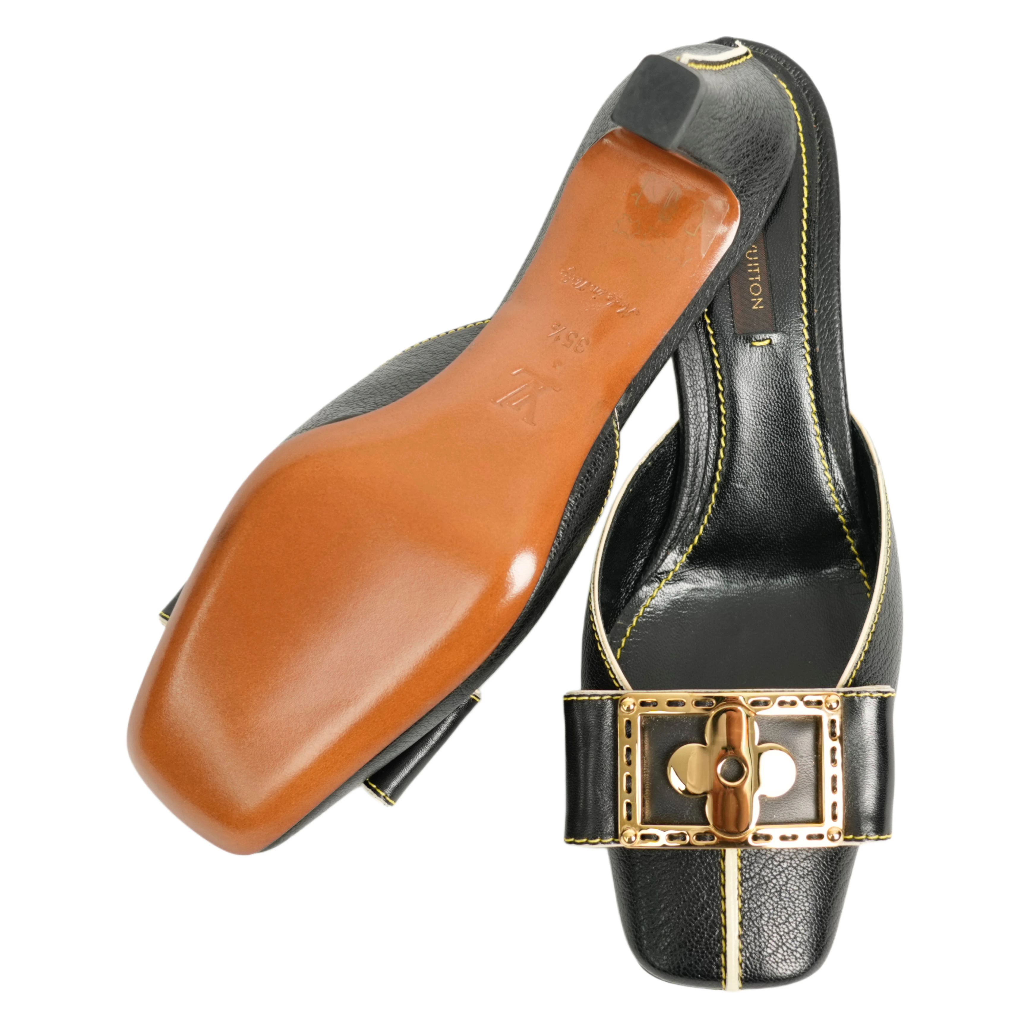 【中古・VINTAGE】 LOUIS VUITTON ルイヴィトン スハライン ミュール 23.5cm ブラック ホワイト ゴールド ヴィンテージ Suhali Line Mules