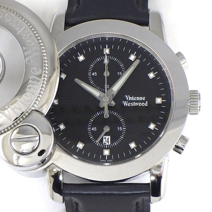 ■商品名ヴィヴィアン・ウエストウッド Vivienne Westwood 腕時計 VW-2063 スライド式 蓋付きケース デイト クロノグラフ スモールセコンド 夜光インデックス 夜光針 ブラック ギョーシェ文字盤 SS レザーベルト クオーツアナログ 【箱・保付き】 【中古】