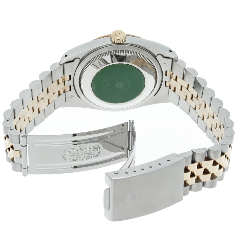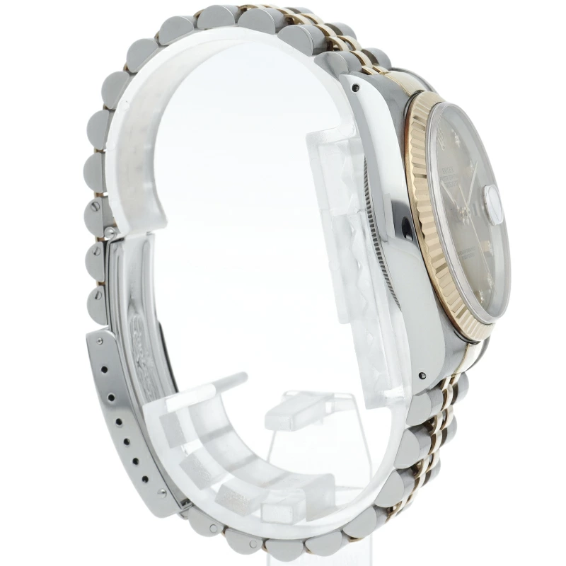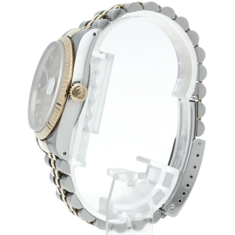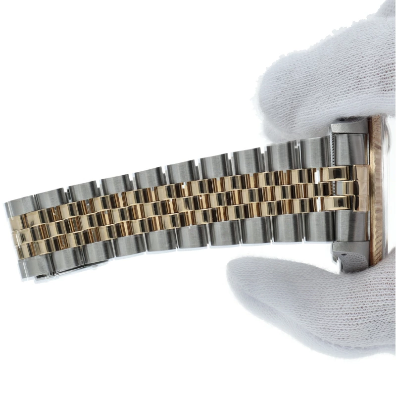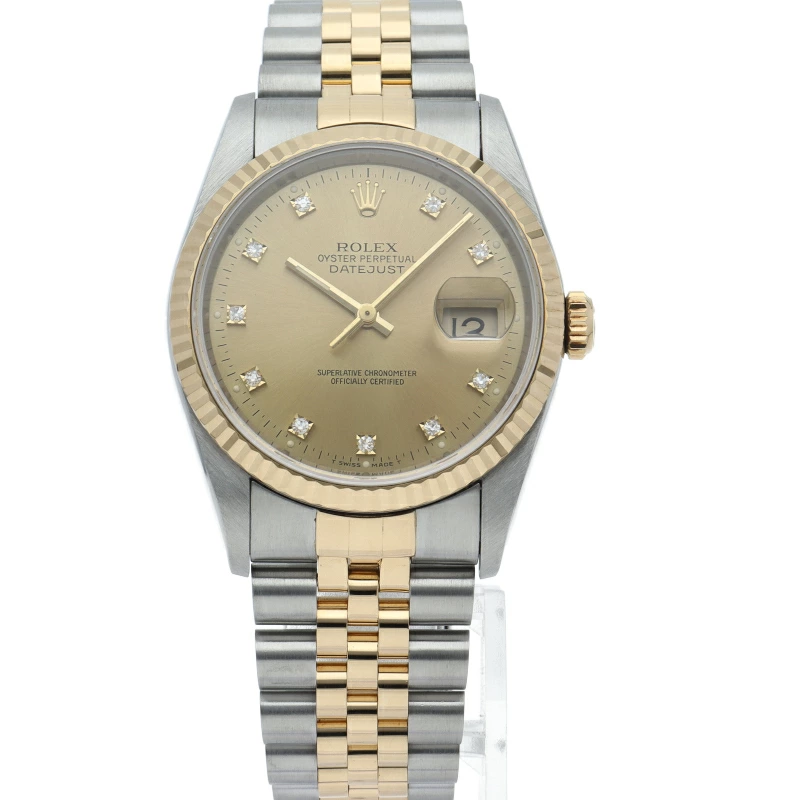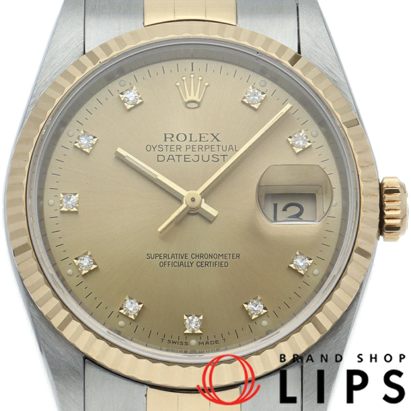 | ロレックスのドレスウォッチで幅広い年齢層に愛されている「デイトジャスト」。イエローゴールドとステンレスのコンビ仕様に10Pダイヤが施されております。 |