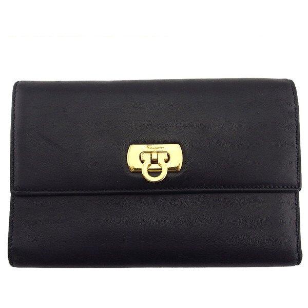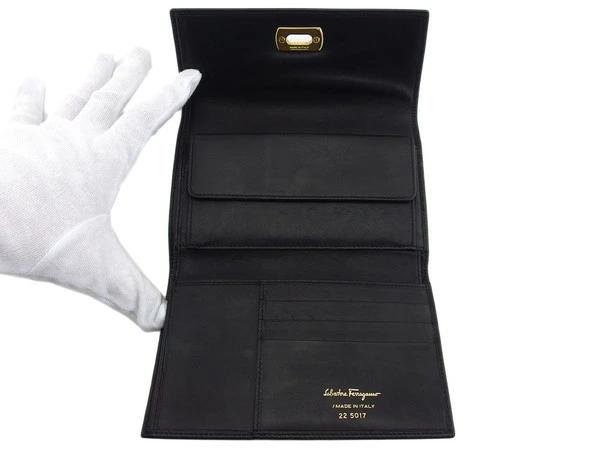 [Rakuten Super Sale ★ Up to 50% Off] Salvatore Ferragamo Gancini Tri-fold Wallet, Black and Gold, Women's, Pre-owned, Salvatore Ferragamo, High-End Brand, Vintage