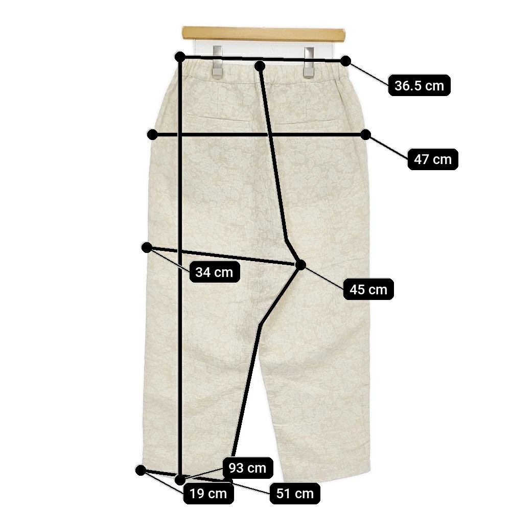 | 実寸サイズ | 総丈:約93cm ウエスト:約36.5cm ウエスト最長:約46cm 股上:約45cm 股下:約51cm ヒップ:約47cm ワタリ幅:約34cm 裾幅:約19cm ※記載以外のサイズが合わないことを理由とした返品はできませんので、 記載部分以外で実寸サイズの気になる箇所があれば必ず購入前にご質問ください。 |