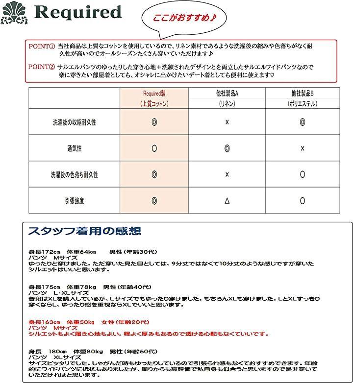 Requiredのパンツは楽に着こなすサルエルパンツが欲しいけど、個性的すぎて勇気がいるというユーザー様の声より開発されたサルエルジョガーパンツですサルエルパンツのゆったり感を維持しつつも、ダボダボ感を抑えてスタイリッシュな新しいサルエルパンツを作りましたRequiredのパンツはバランスの取れたシルエットに作られていますのでシンプルスタイル(無地のTシャツ等)でも、パンツのシルエットが変わるだけでとてもオシャレ感がアップします。