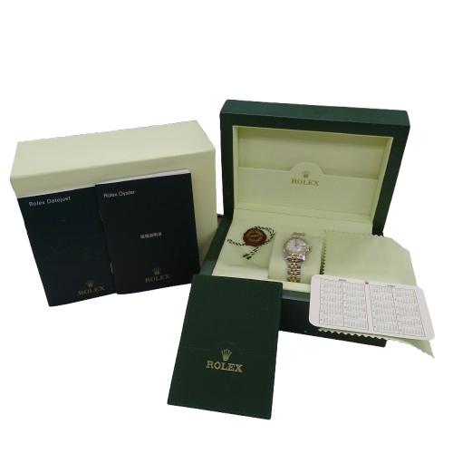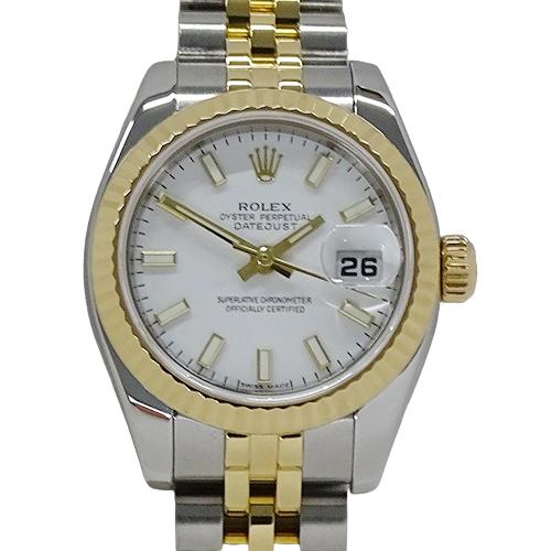Brand RolexProduct name Rolex ROLEX Datejust 179173 F series Watch Ladies Brand Automatic AT Stainless steel SS Gold YG Combination White PolishedModel number 179173 F series (2003-2004's)Color Dial whiteMaterial SS/YGCountry of manufacture SwitzerlandReference price -Size -Measurements Wrist circumference: 16.5cmCase width: 26.0mm (excluding crown)●For product measurements, please see here.Function Calendar type: DateMovement: Automatic ATAccessories Storage box (scratches and dirt) Booklet 2 Case Calendar Tag*Items not listed are not included as a general rule.Rank BCondition This is a normal USED item.Details: Scratches on the crystal, tiny chips on the edge, tiny stains on the inside, stains on the hands, scratches on the bezel, scratches on the inside of the bracelet from the buckle, scratches where the buckle is open, scratches on the back cover. Daily difference is about +3 seconds.Operation confirmedPolished in our own workshop.* Serial numbers on the back cover are hidden.* This is a used item. There is no problem with using it, but please refrain from purchasing if you are sensitive about such things.
