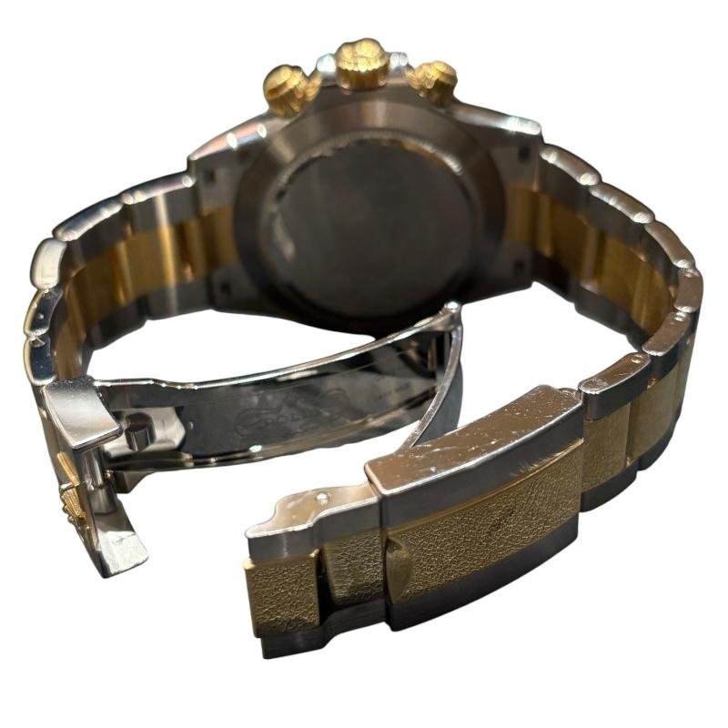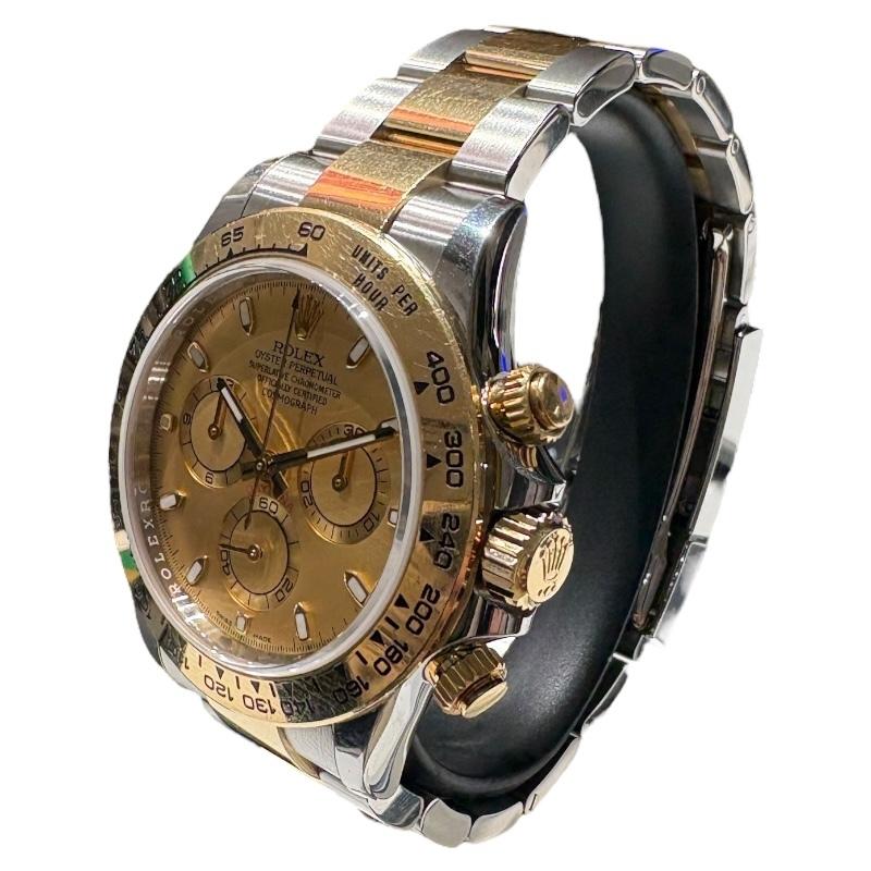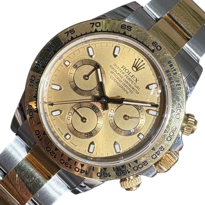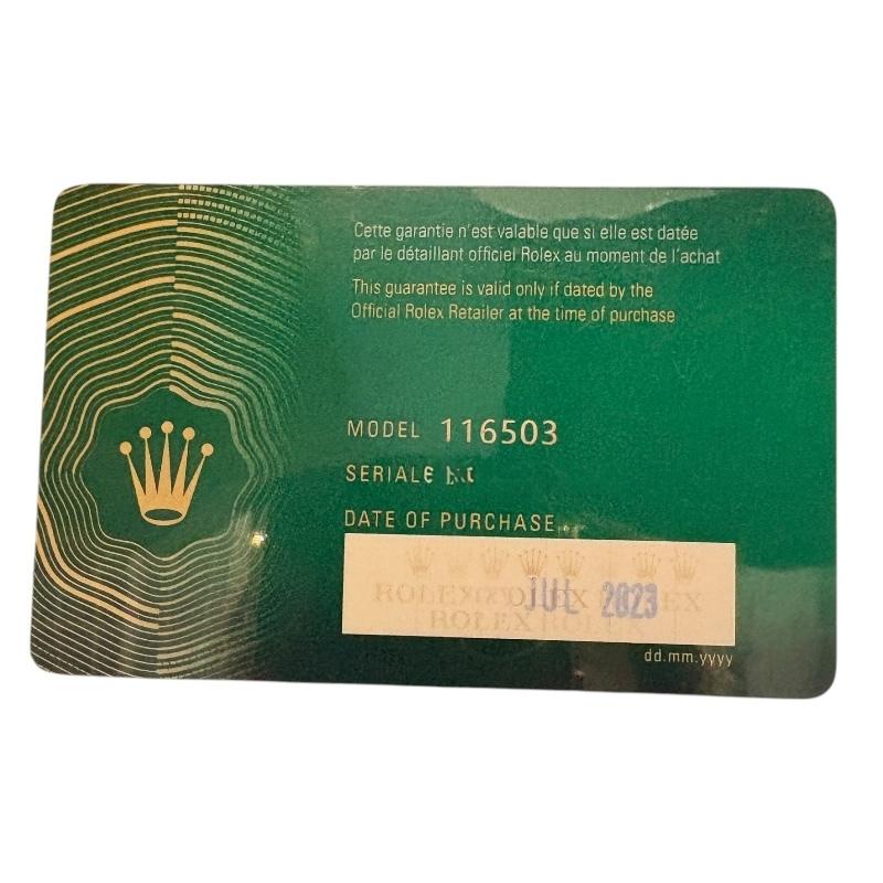 Brand: ROLEXModel: 116503Product name: DaytonaMaterial: K18/SSDial color: GoldTarget: MenMovement: AutomaticWindshield material: Sapphire crystal windshieldWater resistance: Waterproof to 100 mFunction: ChronographWrist size: 16.5 cmCase: 40 mmCase shape: Round faceAccessories: Warranty card, warranty card (2023/07), not original box [The items shown in the accessories column and in the images are all accessories]Condition: Many small scratches overallHands skipped