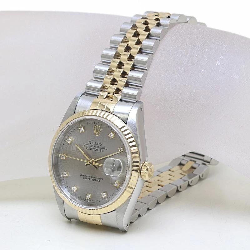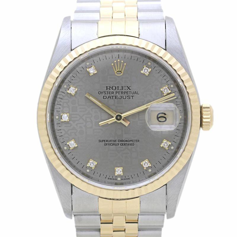 | | 商品説明 |  | | 取扱店舗 | 銀座店 (TEL03-6264-4880) |  | 状態 | 中古ABランク |  | 型番 | 16233G |  | 素材 | K18YG イエローゴールド / ステンレススチール |  | 文字盤 | グレープリントコンピューター/10Pダイヤモンド(旧留め) |  | サイズ | [ケース幅]約36mm(リューズ除く)