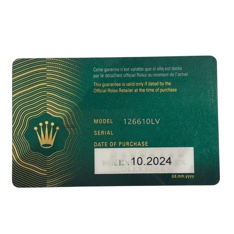 Brand: RolexModel: 126610LVProduct name: SubmarinerMaterial: Stainless steelDial color: BlackTarget: MenMovement: AutomaticCalendar type: Date displayWindshield material: Sapphire crystal windshieldWater resistance: Waterproof to 300mFunction: Date displayWrist size: 18.5cmCase: 41mmCase shape: Round faceAccessories: Warranty (2024/10) [The items in the accessories column and shown in the image are all accessories]Condition: There are small scratches due to use overall.