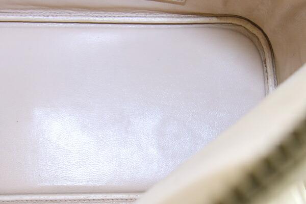 状態:外側:所々スレ・薄黒汚れ・茶系の接着剤跡汚れあり。持ち手に赤系の色移り汚れあり。底フチ周りにスレヨゴレあり。内側:小キズ、薄汚れ、シワあり。金具:小キズ、クスミ、変色あり。底鋲1箇所に保護取れあり。※内側ロゴ下にネームタグ(MITSUKO刻印)あり。